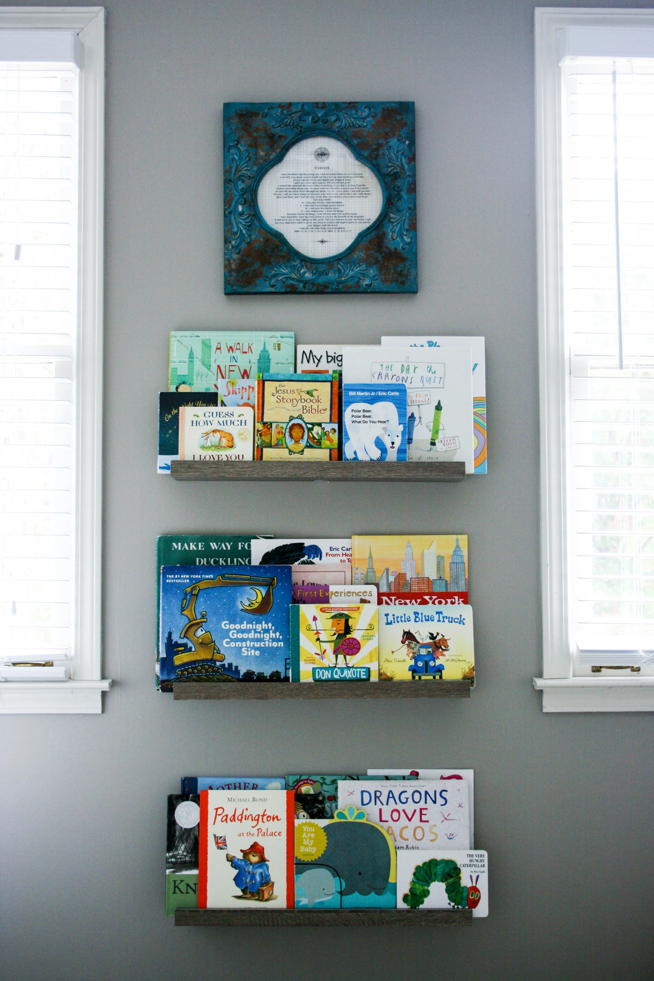 These are actually picture ledges but we layered all his favorite books on the shelves instead. He loves scooting his stool over to this area and picking out books from the top shelf. Anything that seems like a challenge, right? Also, the picture above the books is a prayer for Everett, a gift from before he was born. Good stuff.