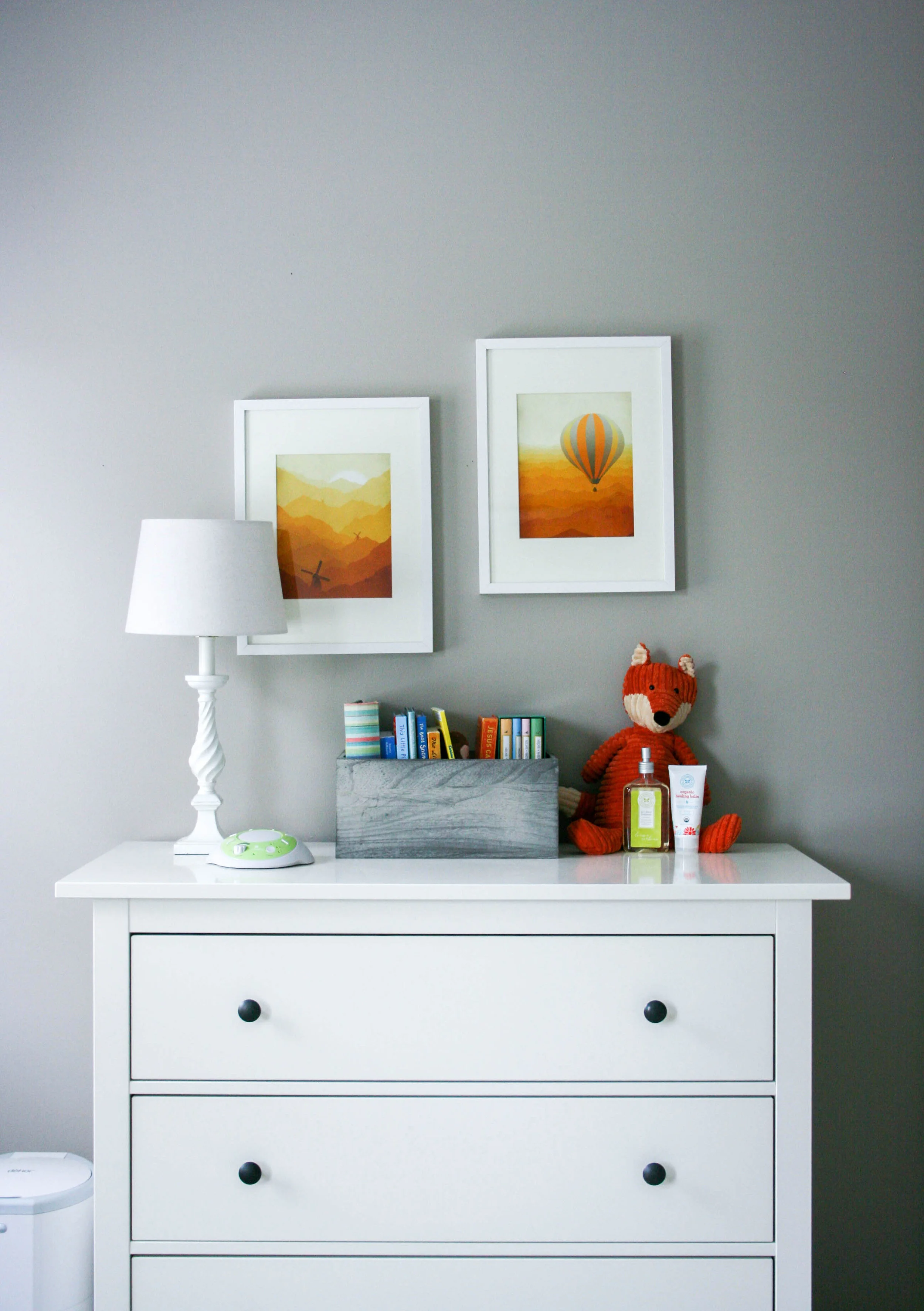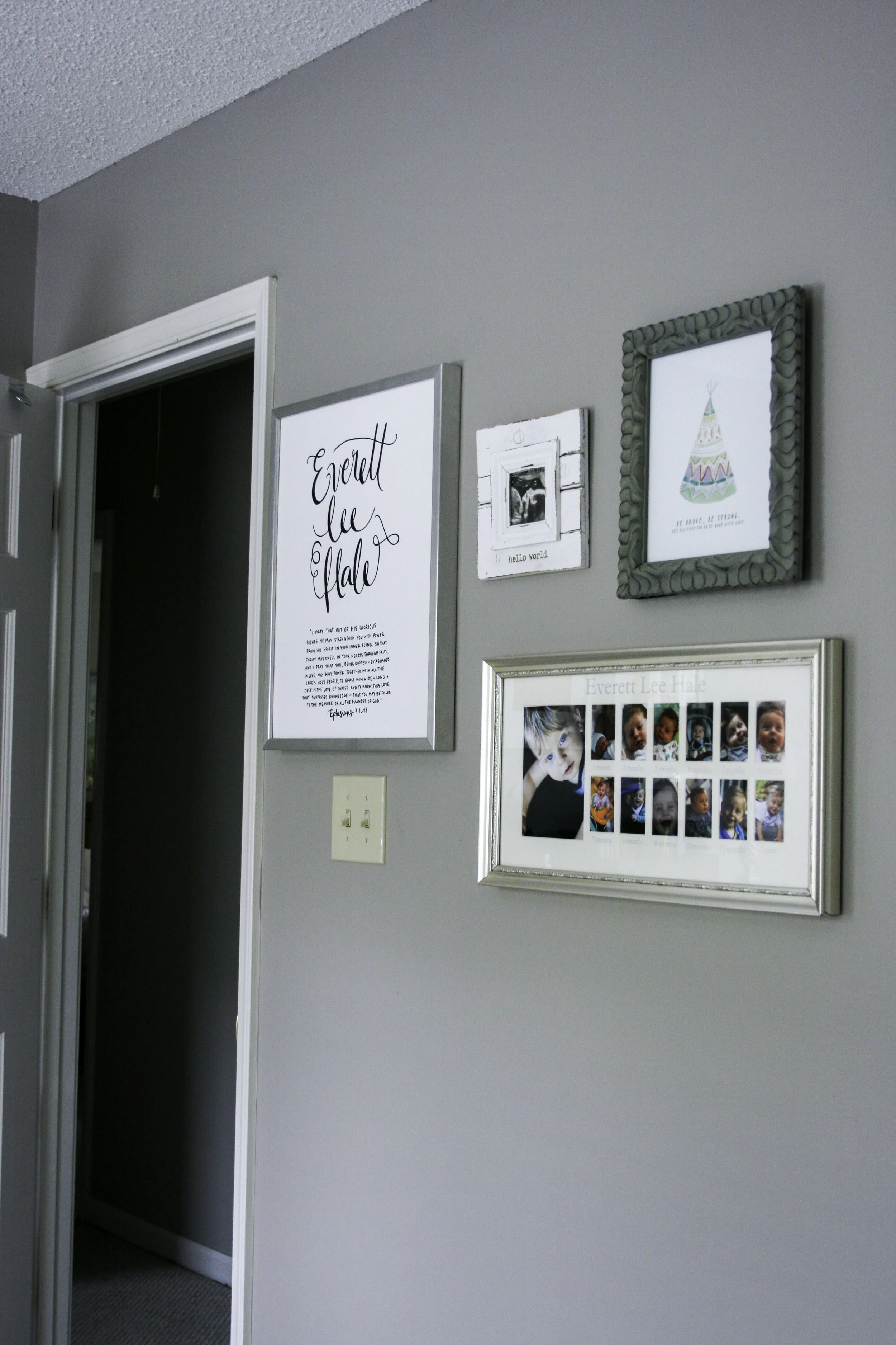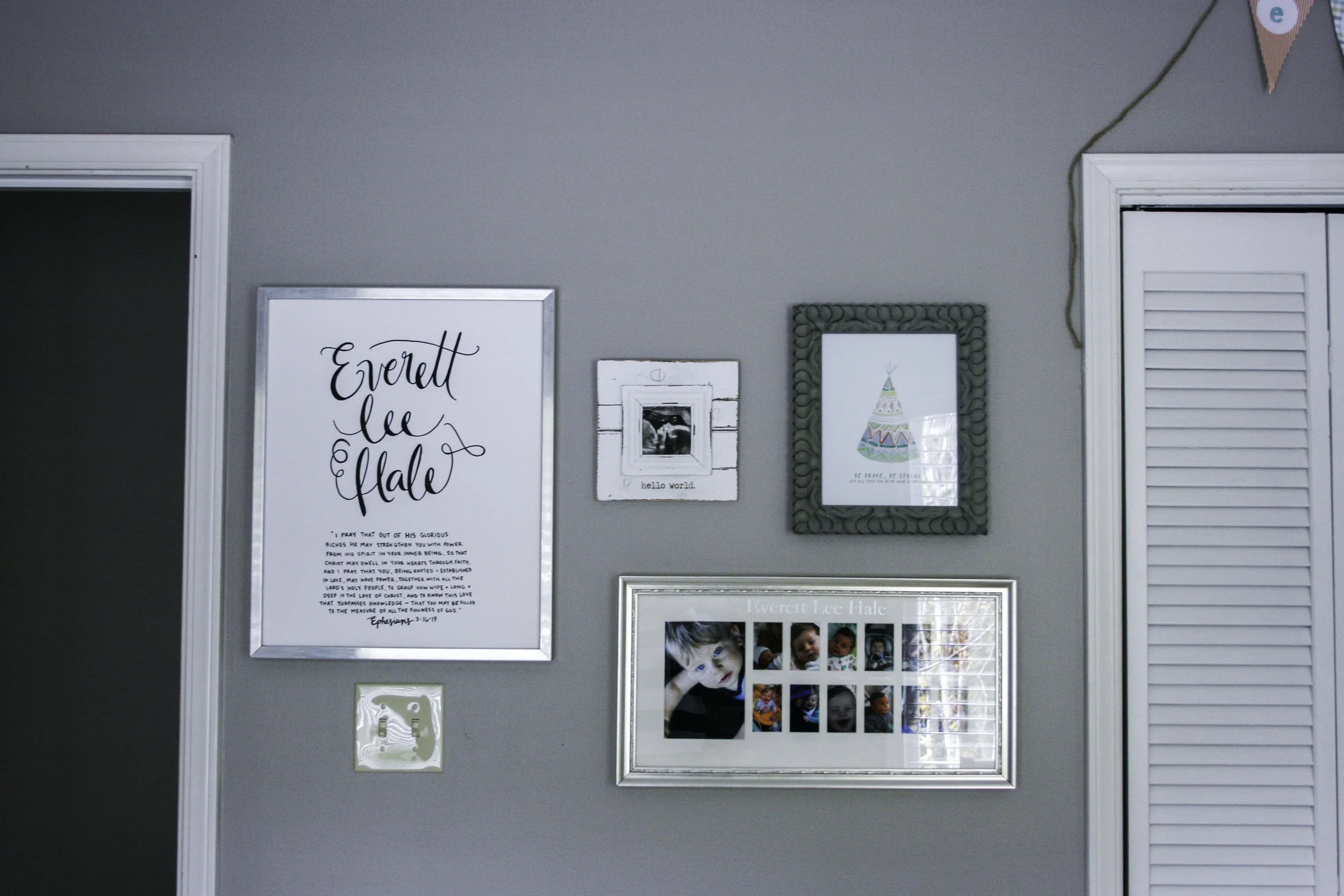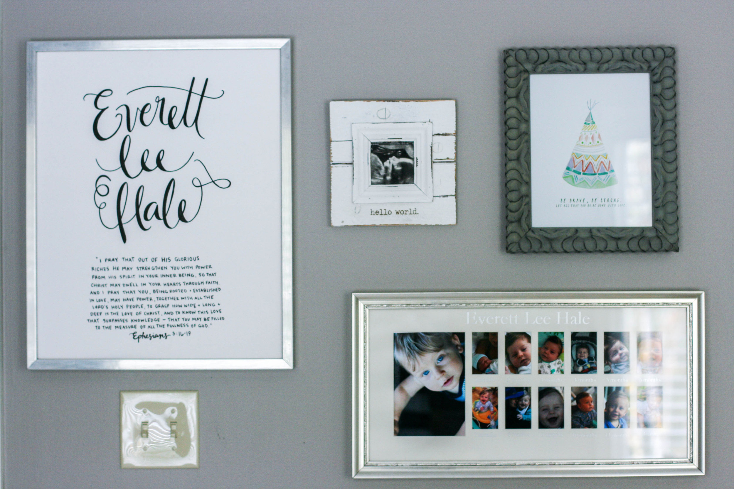 I love this little picture wall - it's the life of Everett thus far! A custom name print by Jenny Highsmith, his first ultrasound photo, a gifted print from my BFF Natalie and a sweet month-by-month frame of his first year from Pottery Barn.