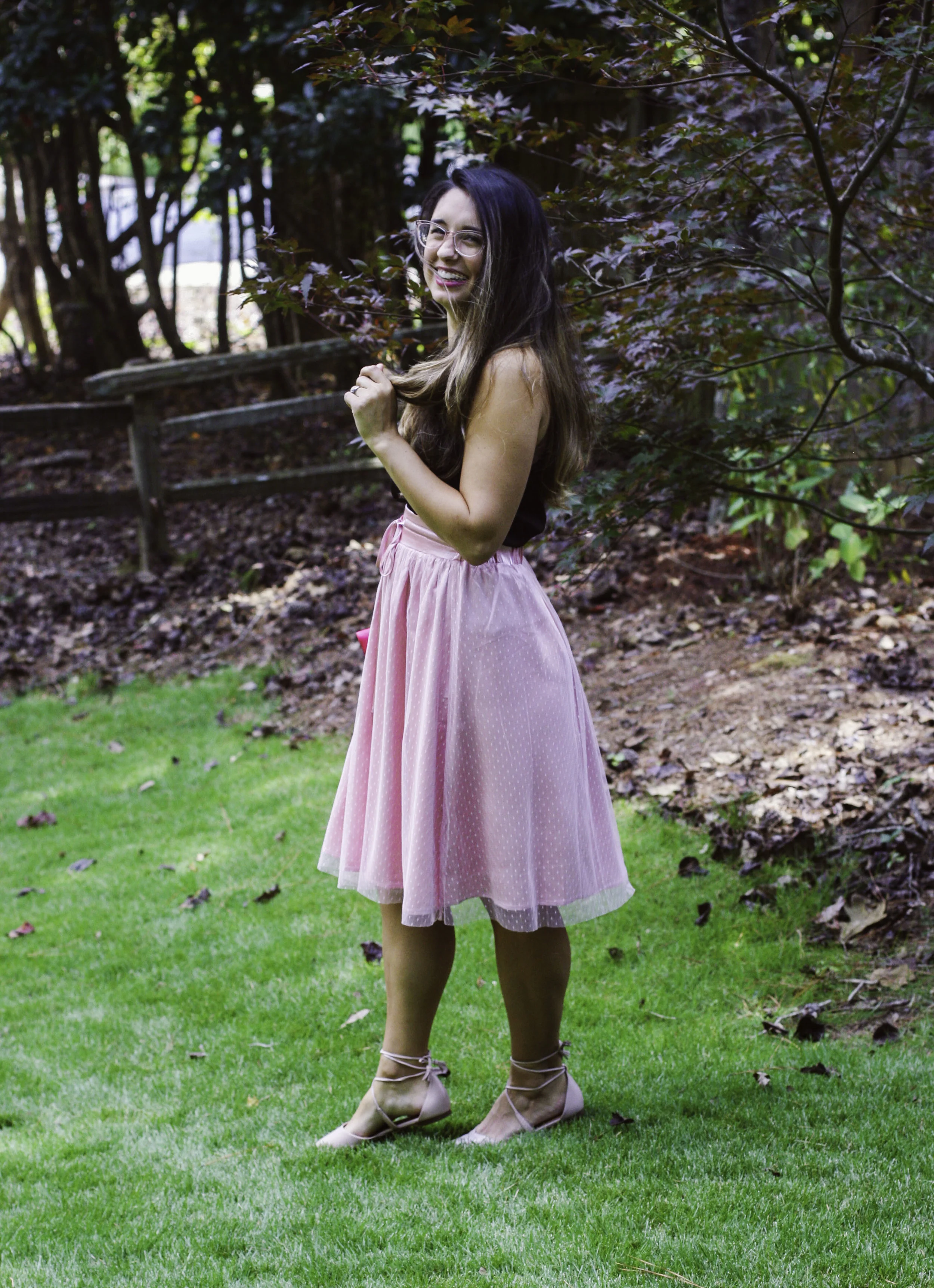 Warby Parker Louise glasses in small Rosewater, Anthropologie skirt (sold out, similar here), Urban Outfitters cami (past season, similar here), Halogen lace-up flats, Banana Republic clutch (past season, similar here), Fab'rik Keyhole bralette (similar below), ILIA multistick on my lips and cheeks in shade "A Fine Romance"