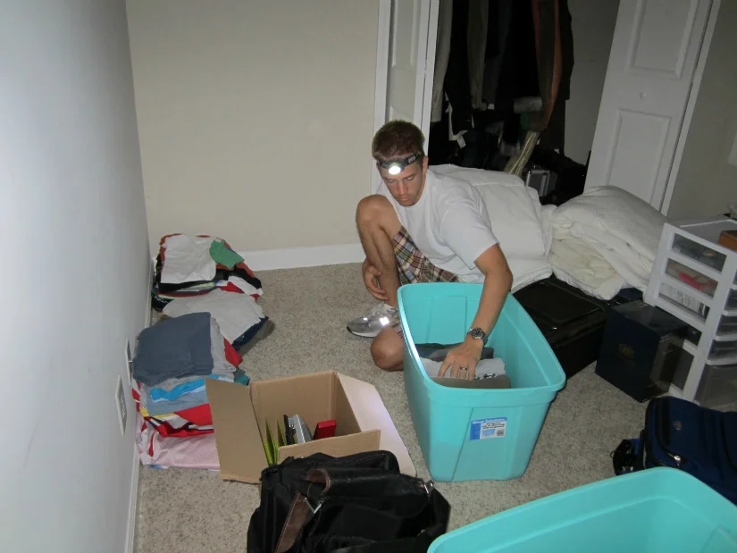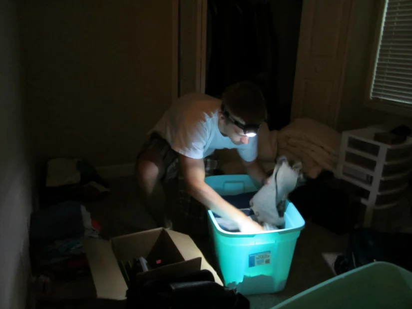 /We sold all our lamps. Well, technically, we sold everything. But when you sell all your lamps, you lose your light. In an apartment that has NO overhead lighting, those lamps are pretty important. Which I quickly realized, when I came home from work one day and found my husband packing like this.