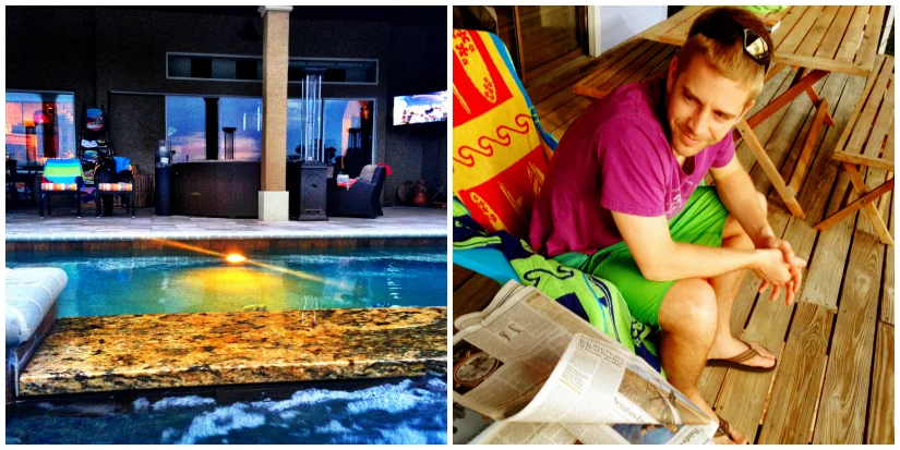 // My view from the hot tub, overlooking the pool. Yes oh yes. // He reads the paper ON VACATION. Such a student. //