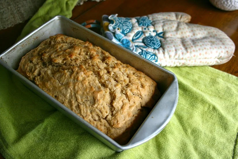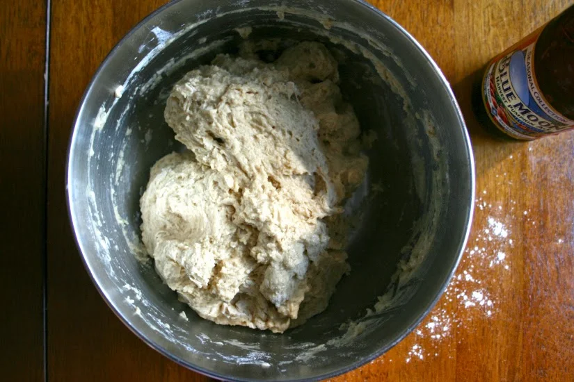 3. Dump the bottle of beer into the dry ingredients. Combine until mixed into dough. Scoop dough into the loaf pan.