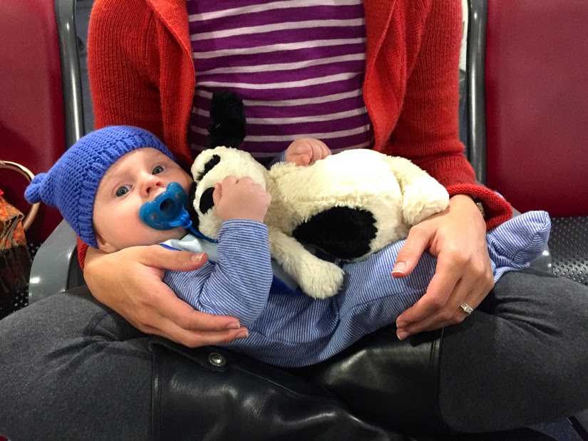 Dress your baby in a long-sleeved onesie, if you can. It makes for easy diaper changes, keeps them warm on the flight, and allows for a simple wardrobe swap in the case that things get messy. Make sure you have all kinds of back up onesies - I think I brought on three changes of clothes! Of course, when you're actually that prepared, you never need all of those. I also made sure to keep him in a hat, socks and shoes, and a coat, just because it was November and we were heading to NYC. Didn't want him to get too cold en route!