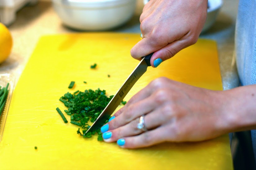3. Add in the artichokes, olives, chives. Season with salt and pepper and drizzle with lemon juice.
