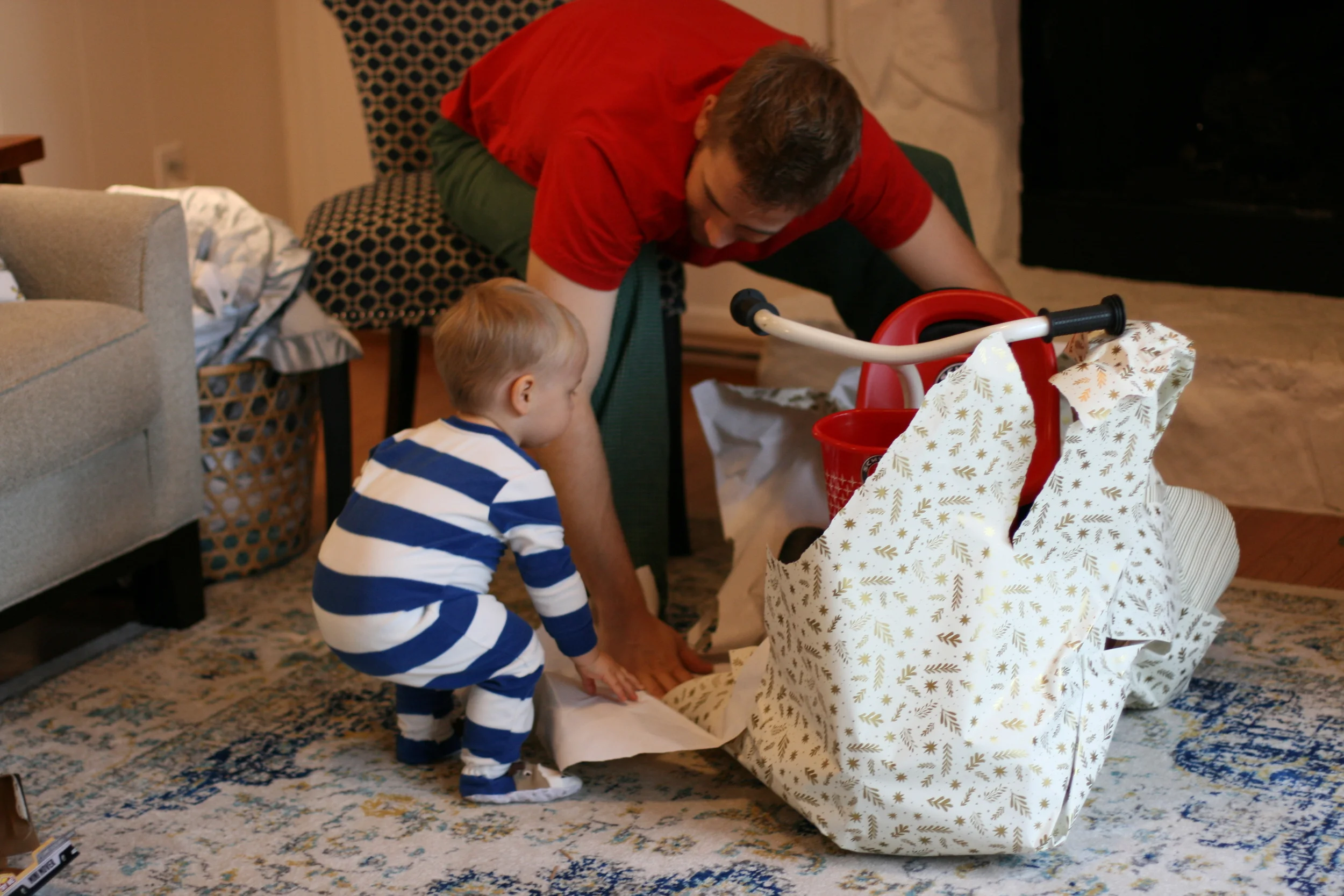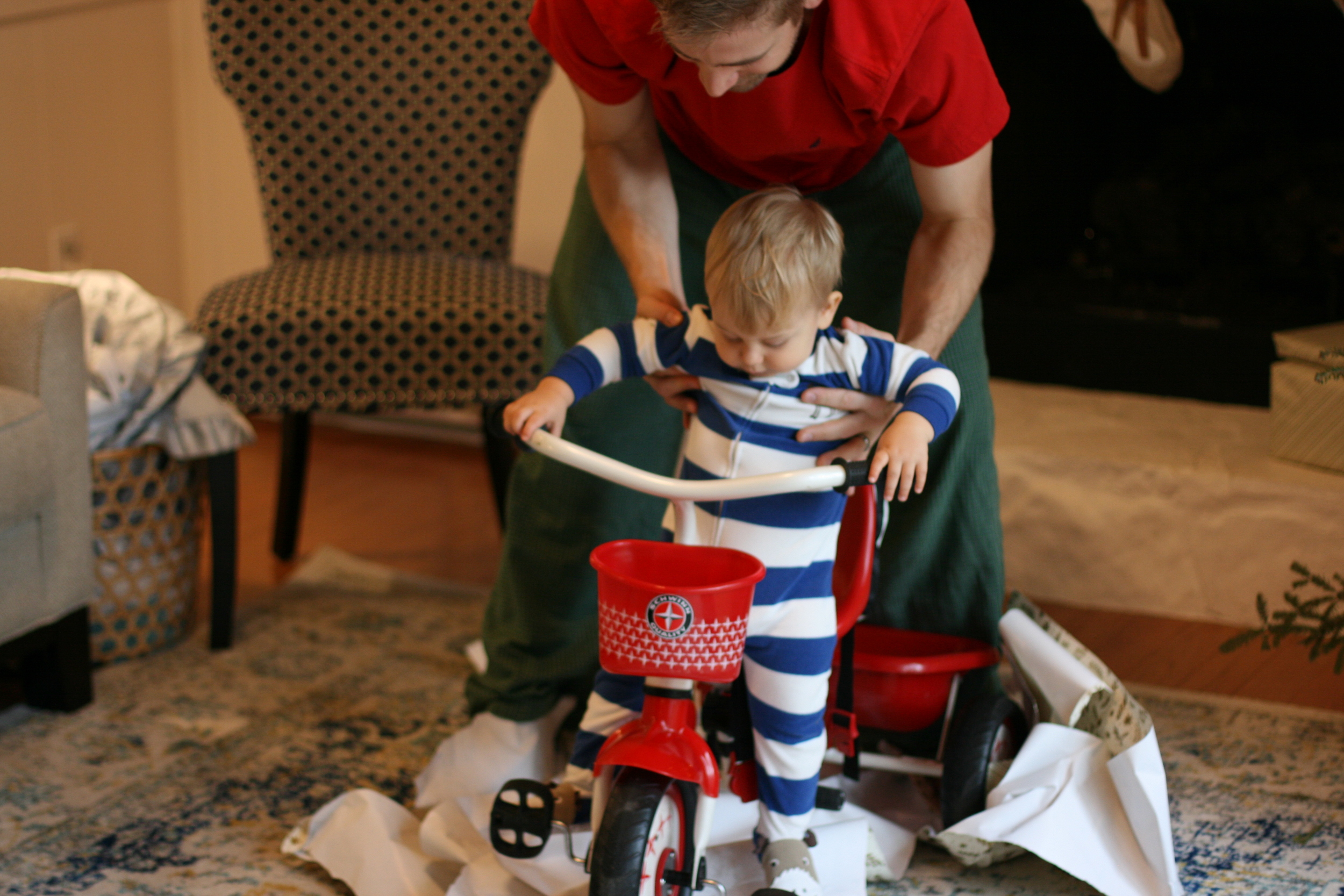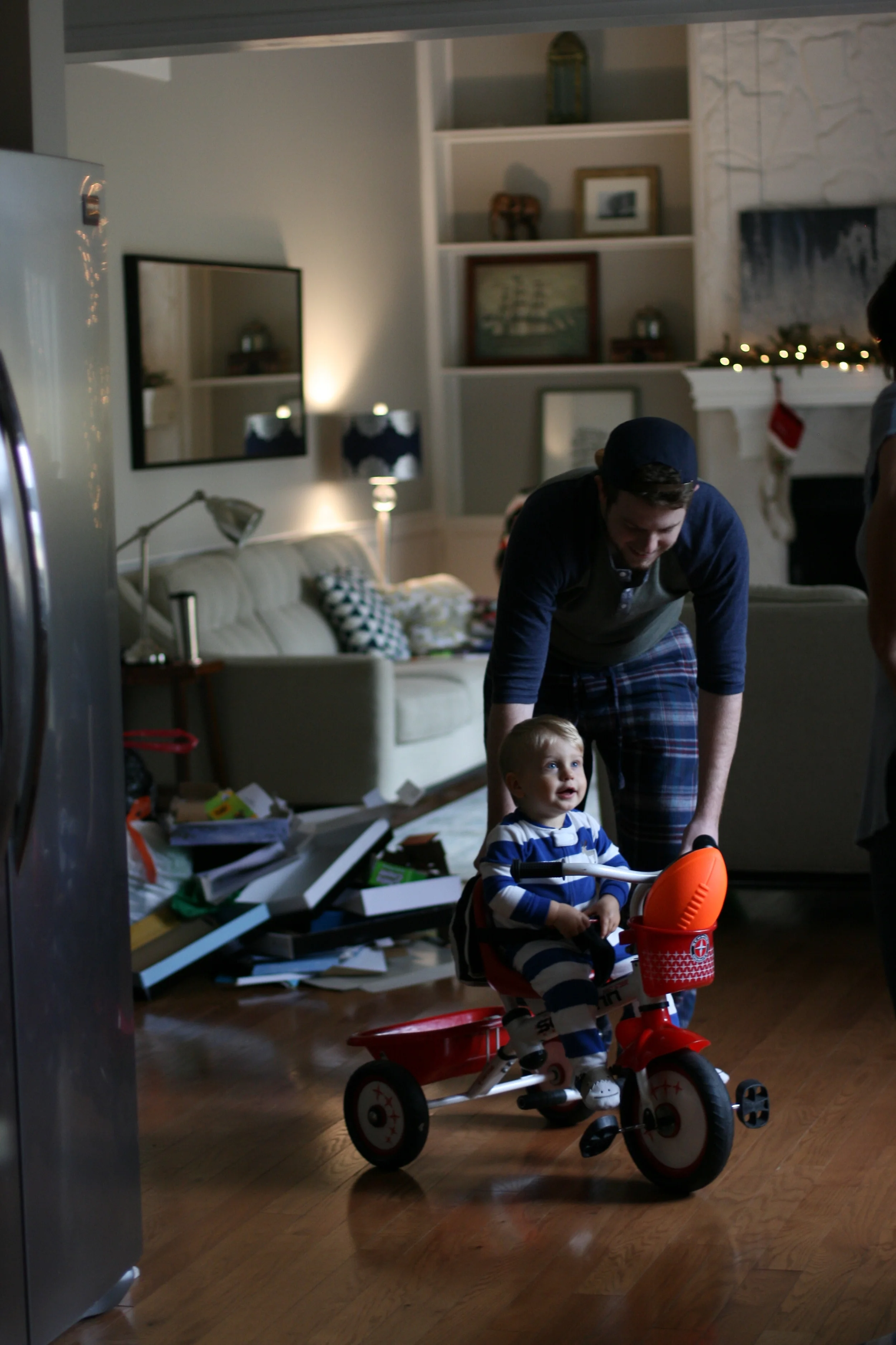 Once we got to Christmas morning, Everett learned what those boxes under the tree were all about. He did such an adorable job, unwrapping each gift and gasping at what was inside. He is hilariously expressive. It was so fun to give him a few "boy" gifts, like toy cars and trucks (even one he could ride around in!) and a nerf football and even a little trike. He was in Heaven. We were in Heaven. Having a kid for Christmas is more magical than any presents you could open for yourself. And this is coming from a girl who is a former present hog. But it's just so true.