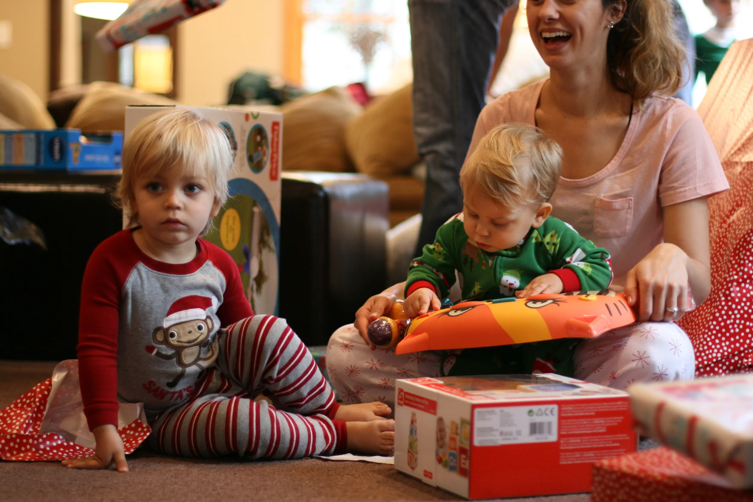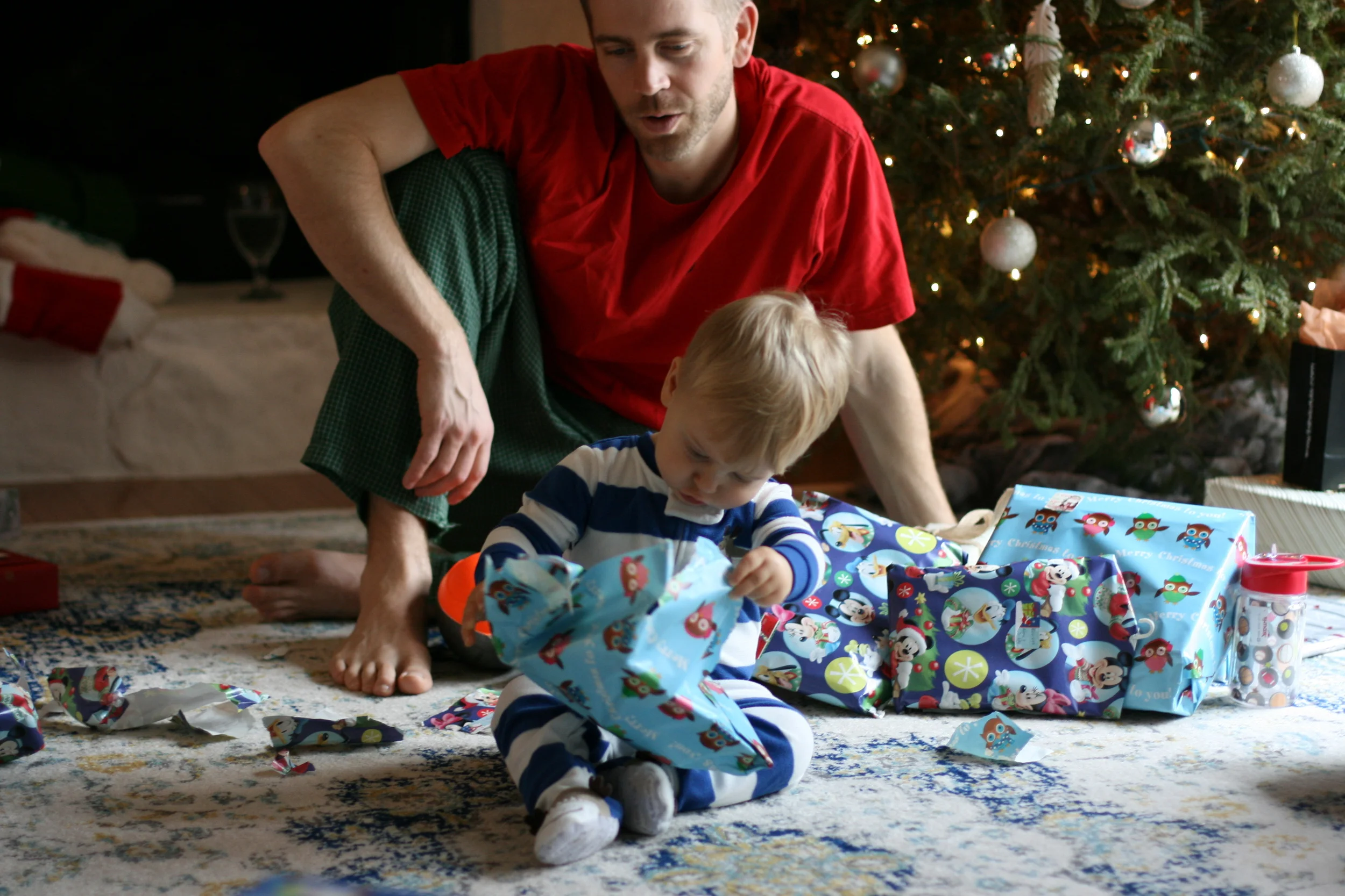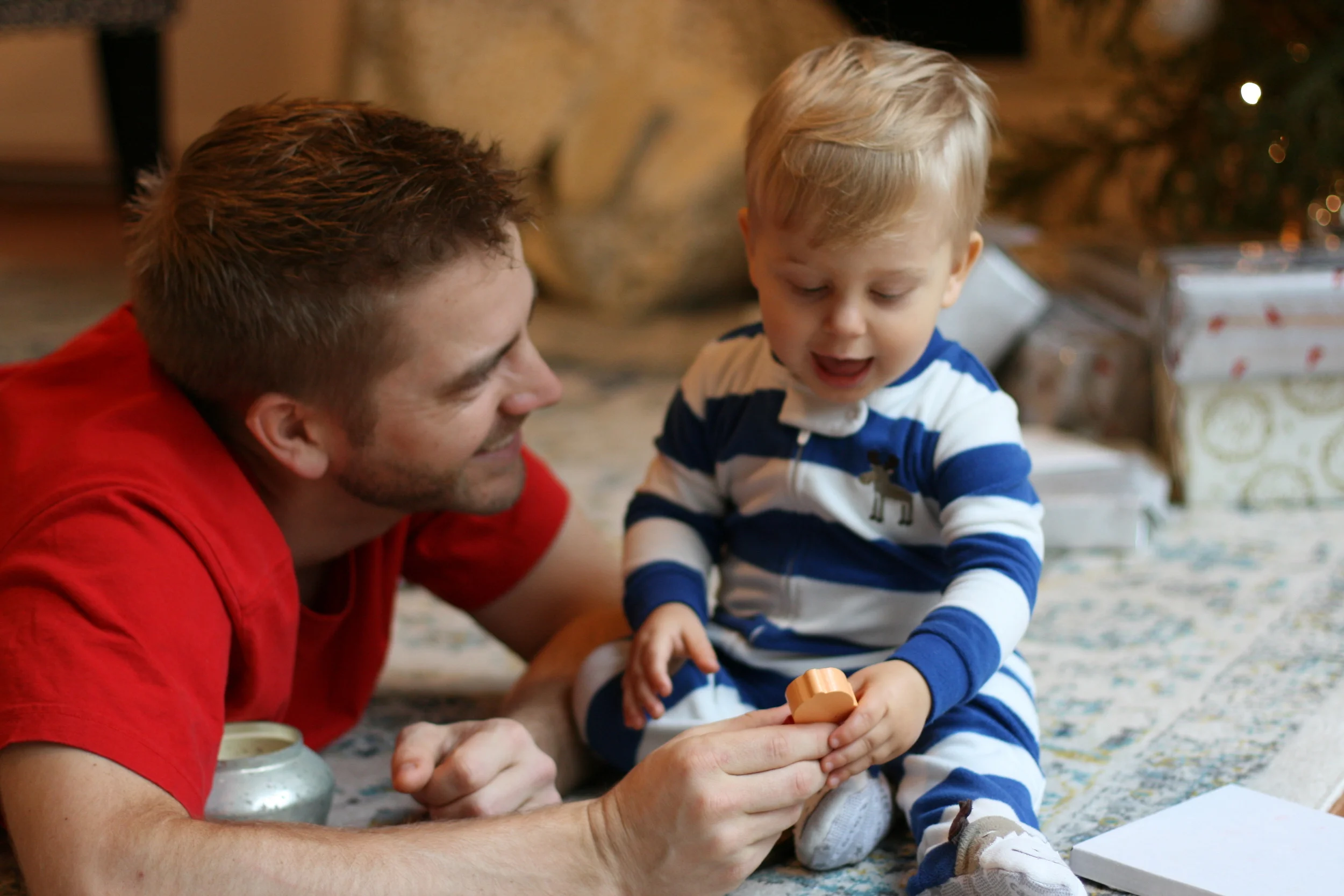 Once we got to Christmas morning, Everett learned what those boxes under the tree were all about. He did such an adorable job, unwrapping each gift and gasping at what was inside. He is hilariously expressive. It was so fun to give him a few "boy" gifts, like toy cars and trucks (even one he could ride around in!) and a nerf football and even a little trike. He was in Heaven. We were in Heaven. Having a kid for Christmas is more magical than any presents you could open for yourself. And this is coming from a girl who is a former present hog. But it's just so true.