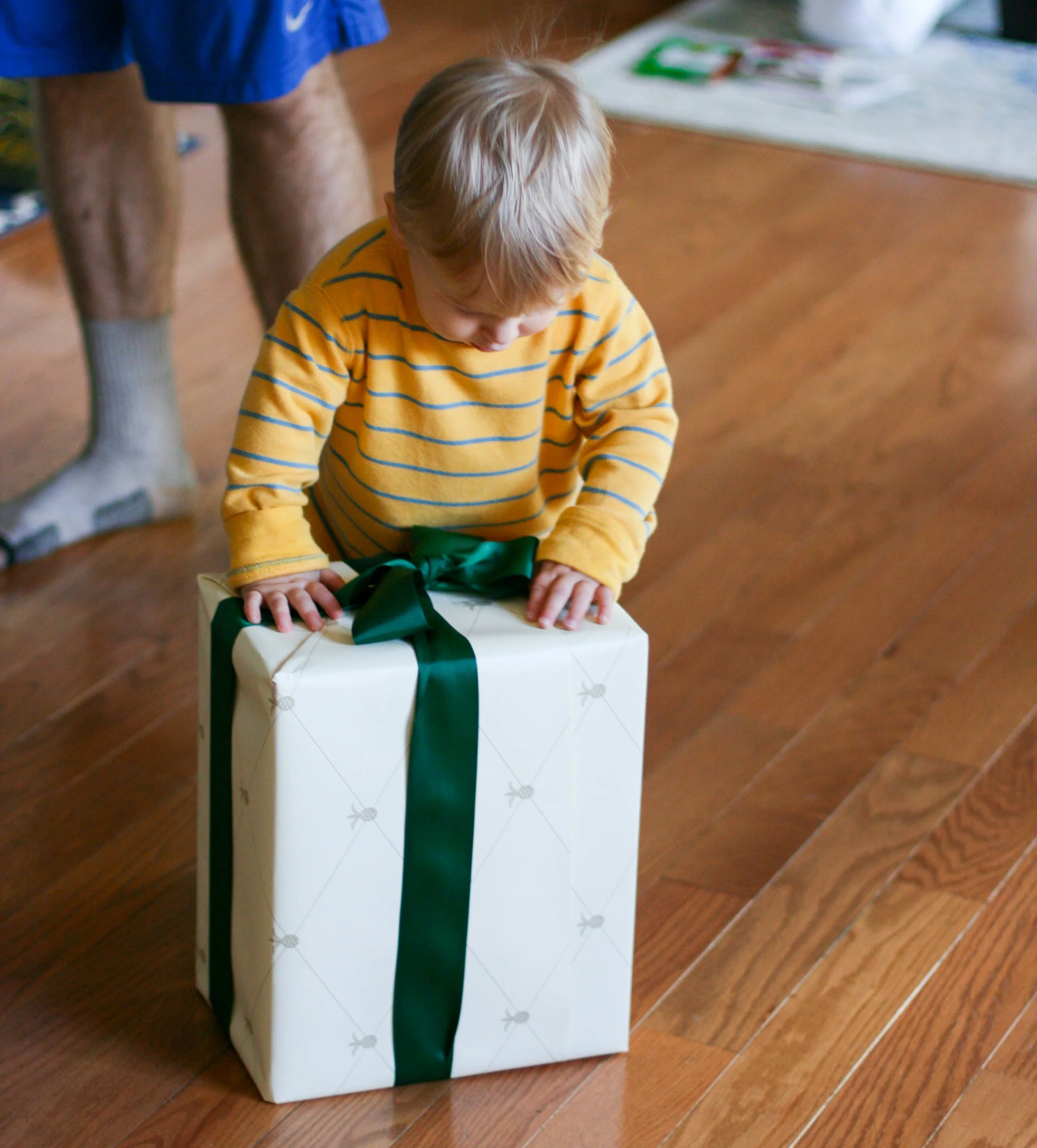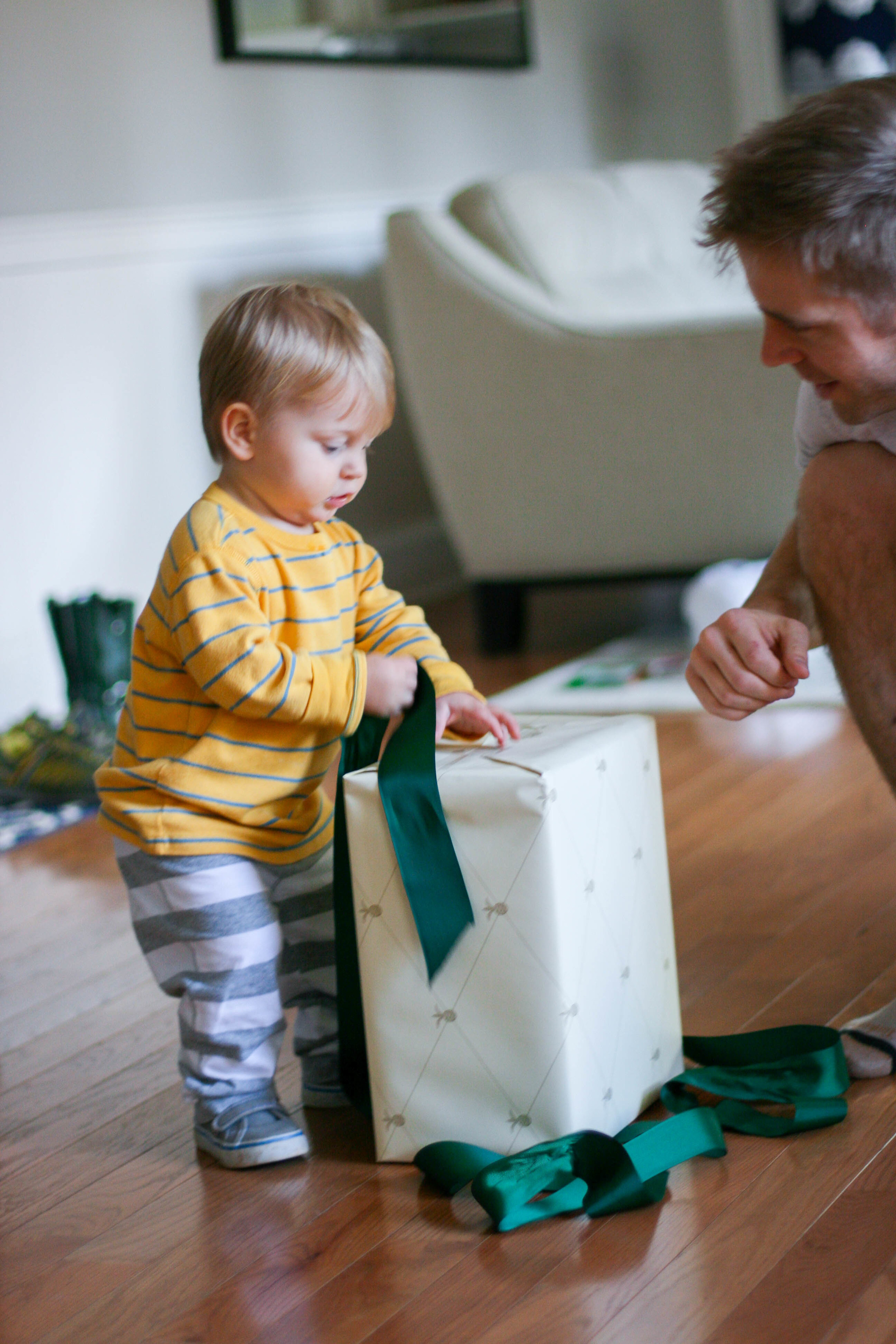 So we gave our son a waffle maker. Technically, this was our "family" Valentines gift, since it was ridiculously marked down at Williams Sonoma and since our son eats an insane amount of waffles. But we let him open it because, lets face it, kids are just really fun to watch open presents. This time was no exception. Everett had no idea what was in that box all wrapped up pretty with paper and a bow, but he sure liked figuring out how to unwrap it, with Daddy's assistance, of course.