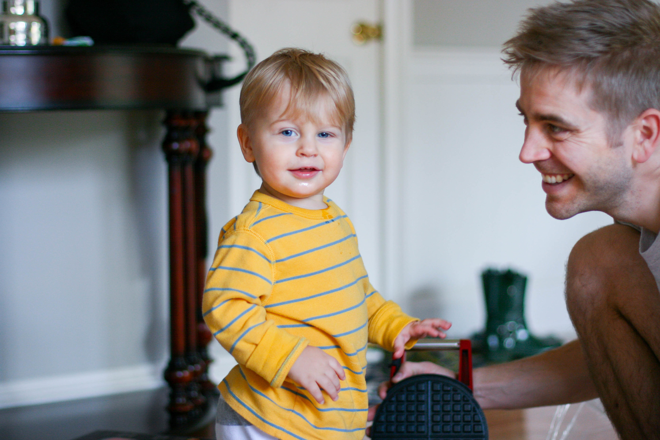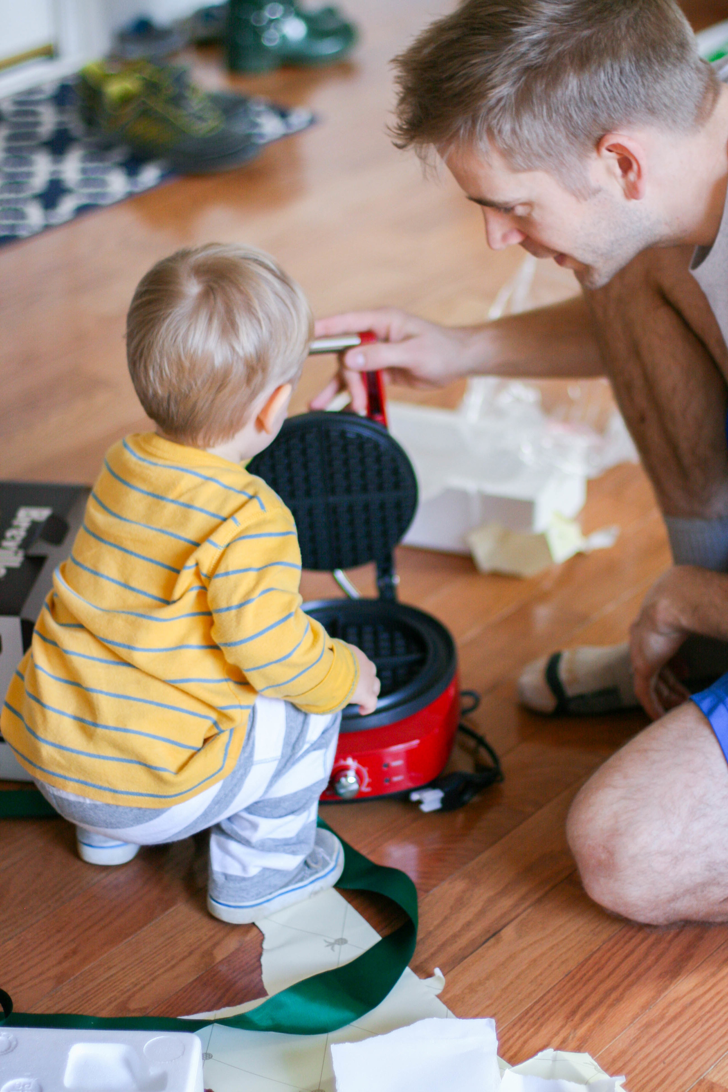 This isn't really about the waffle maker though. There was something especially striking to me about Everett's demeanor as I watched him open this particular gift - an unfeigned wonder. He was genuinely thrilled about the present because he had NO IDEA what could be inside. He didn't know that the paper was from Williams Sonoma and he didn't know that the box stating "Breville" meant it had anything to do with kitchenware (or his favorite food!) He didn't know to be anything but himself, opening that gift. He didn't fake his reaction. He didn't think, "I can return this and get a gift card". He didn't have to like the gift at all. He just had to be himself and open it and for me, it was such a joy to watch it. Did I think I would get a strange reaction from my toddler opening up a waffle maker as a gift? Oh sure. That was like half the fun. I mean, what is a kid supposed to think about that? It's not a ball or a truck or a train. It's a waffle maker. I actually think he "got it" a little more than we anticipated. Once the gift was unwrapped, we explained how we would make his waffle in it and he seemed to understand. You guys, he really loves waffles.