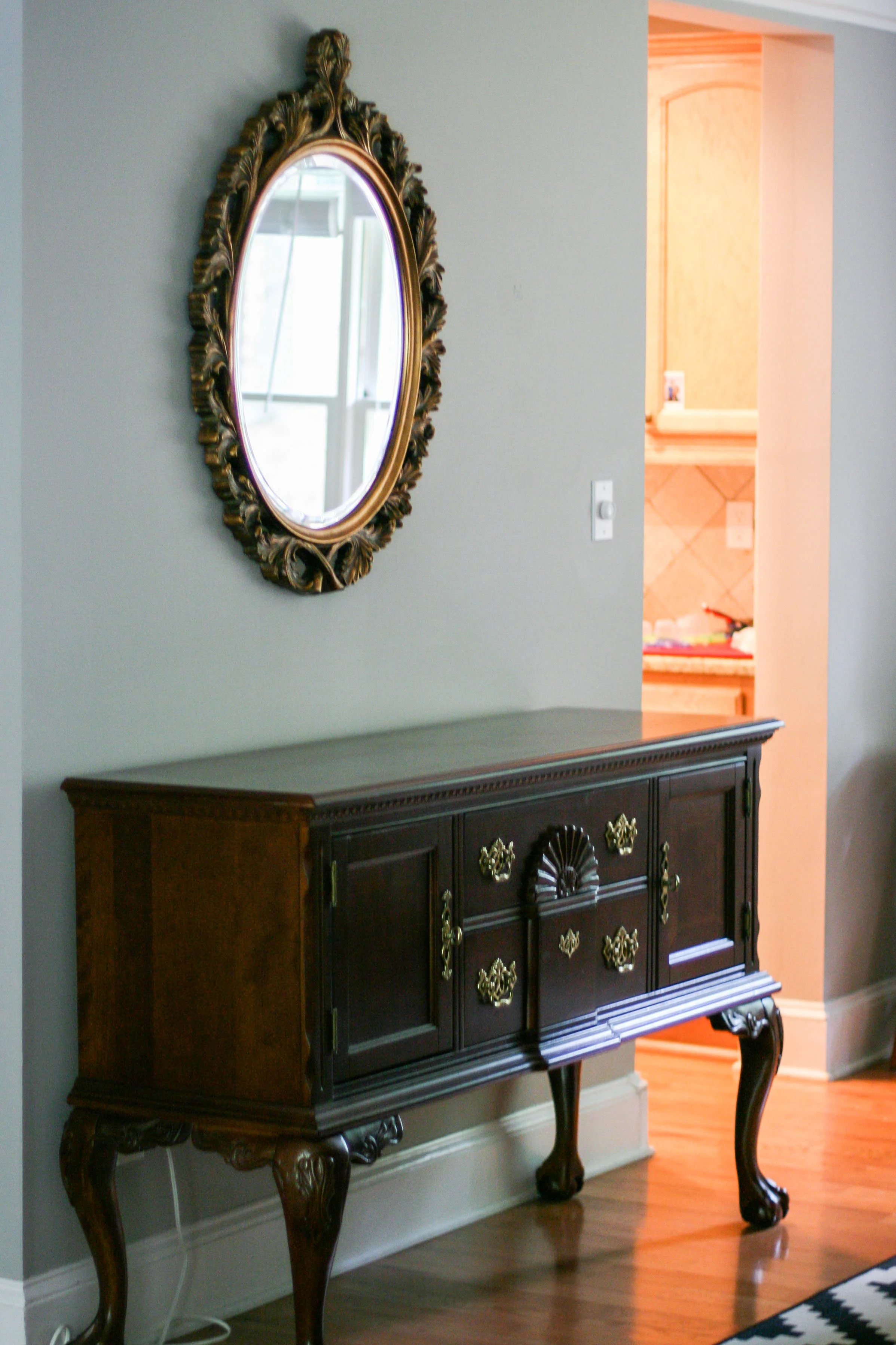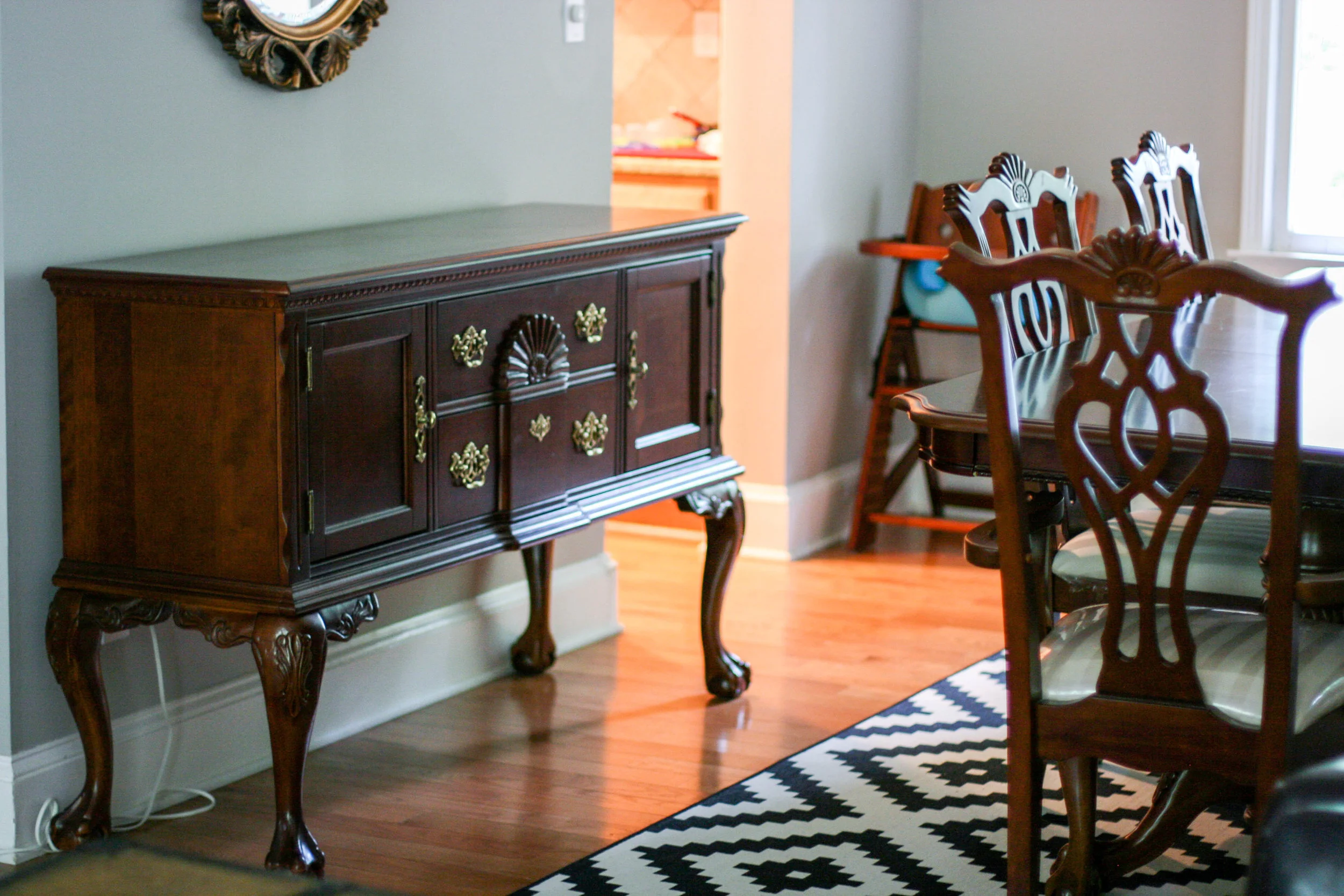 When we moved into our house a little over a year ago, we were given a set of dining room furniture. Yes, given. An entire set of furniture. We were crazy blessed, considering we had no furniture to our name at the time. While the furniture was extremely well-made and in mint condition, it was a little old-fashioned for my taste. Visions of DIY projects filled my dreams, and I had grand plans to flip this furniture and give it a shabby-chic makeover. Little did I factor in the 40+ other home improvement projects, a husband in and out of town with his job, and getting knocked up again into that plan. Those things shifted the priority list, and for over a year I stared at this furniture day in and day out, as it towered over me with its mahogany ferociousness.