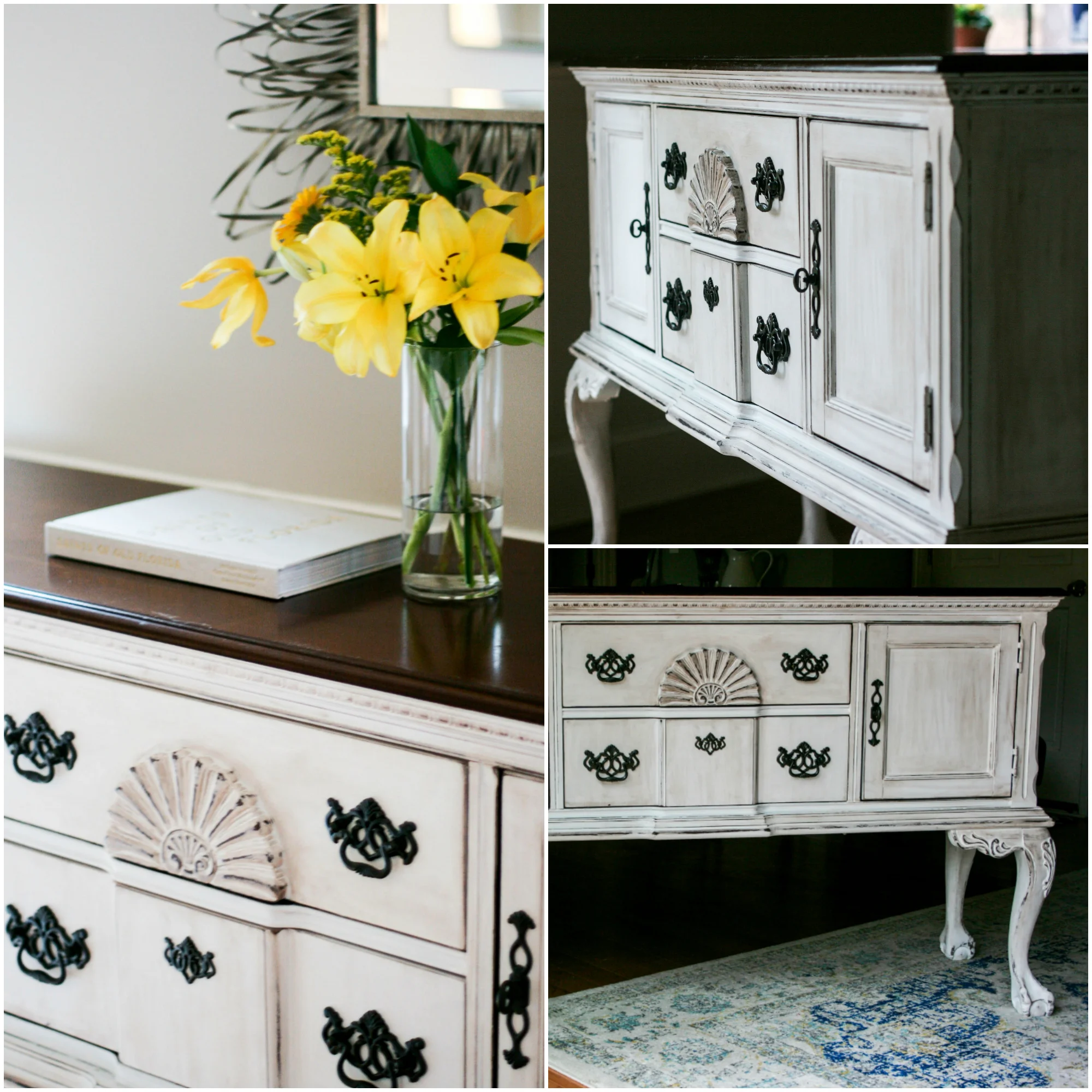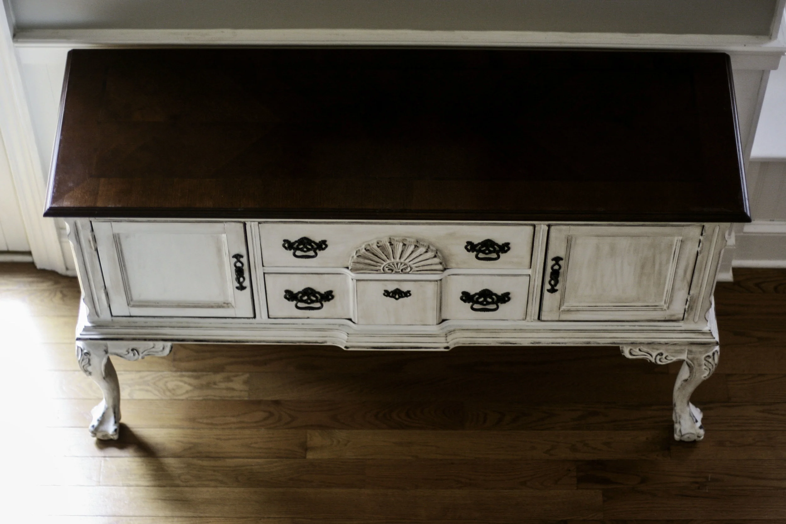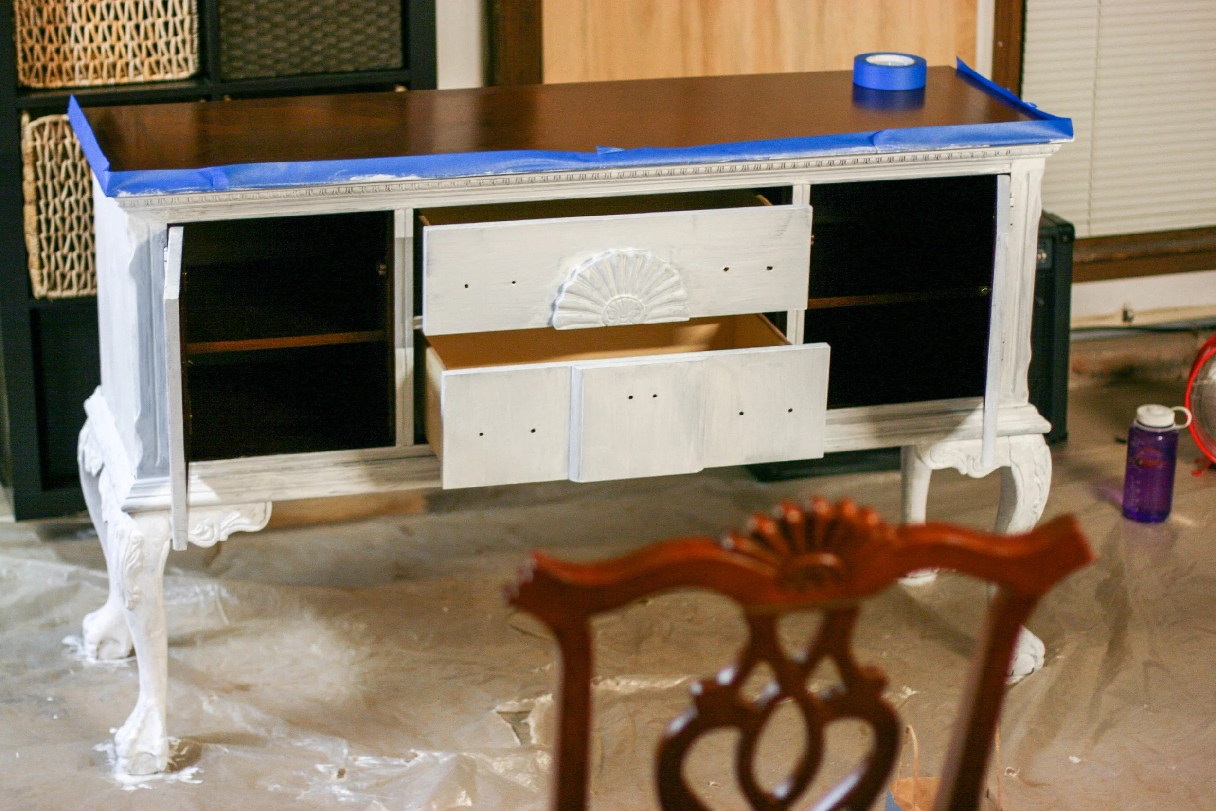 I chose to keep the top of the buffet the original wood, because there was a decorative feature in the grain that I think is super artistic and beautiful. I think the dark wood on top anchors the piece and keeps it feeling "dressy". I decided to move the furniture out of my dining room because it was simply too crowded in there. Now it lives in the living room, and I use it as a bar when we have guests over.