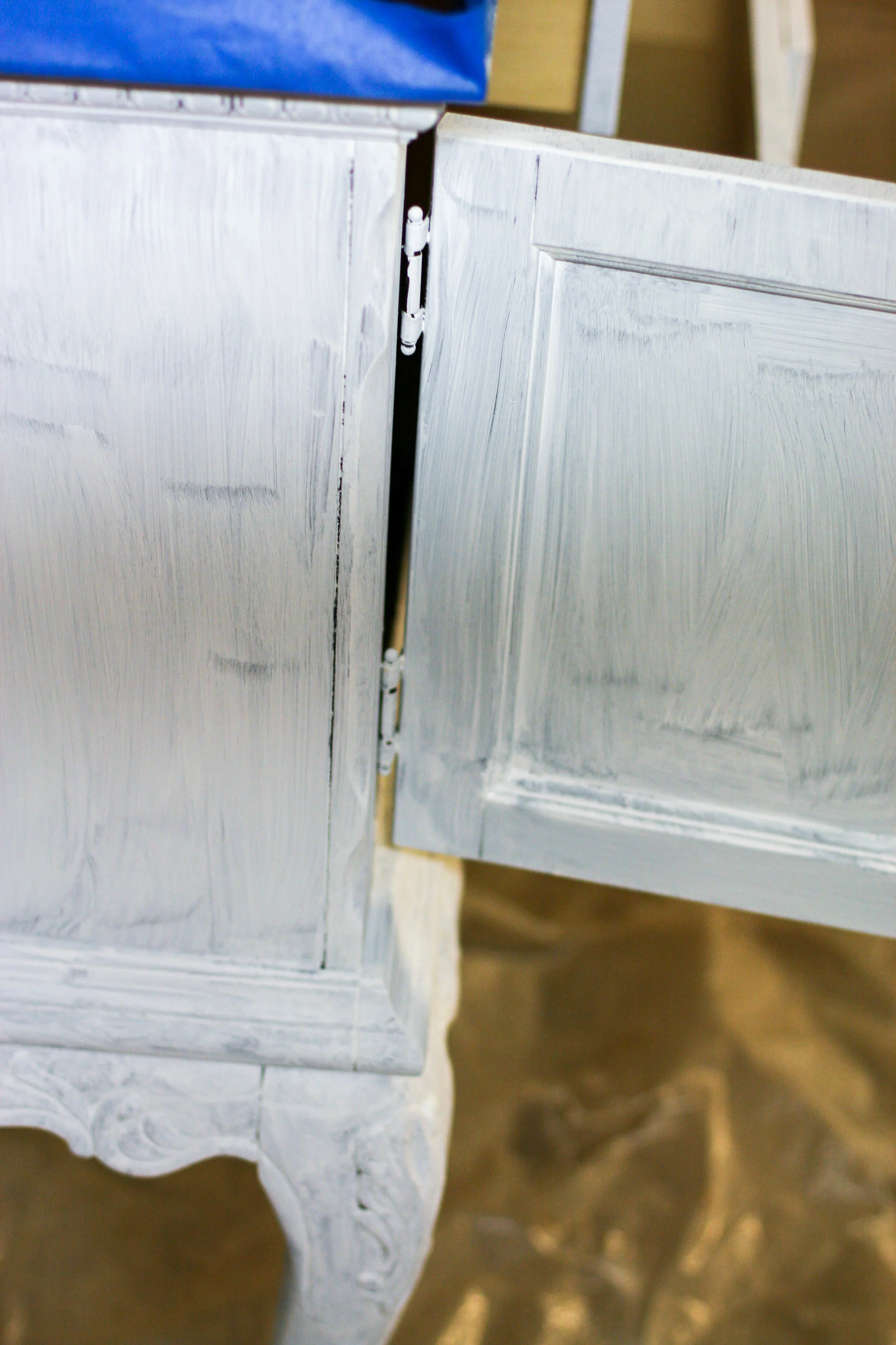 To achieve the antique look, I used Annie Sloan Chalk Paint in Pure White. I applied two coats of the paint, using Purdy 1.5 and 3-inch brushes, letting the coats dry for a few days in between. Using a course grade of sand paper, I sanded the areas I wanted to distress, especially the decorative flourishes in the wood. I wanted those to stand out, so I really went to town on those sections. (If I were doing this project again, I would use an electric sander because this part was very labor-intensive).