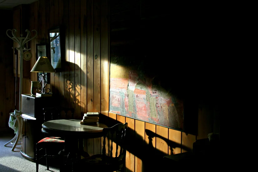 The colors in the home were dark and rich, mixing warm and cool elements. Golden cedar walls, warm plummy paint and robust brass accessories lent to the impressive, old-world feeling of the big airy home. The art hanging on the walls displayed sharp scenery in thickly-painted, slightly careless brushstrokes.