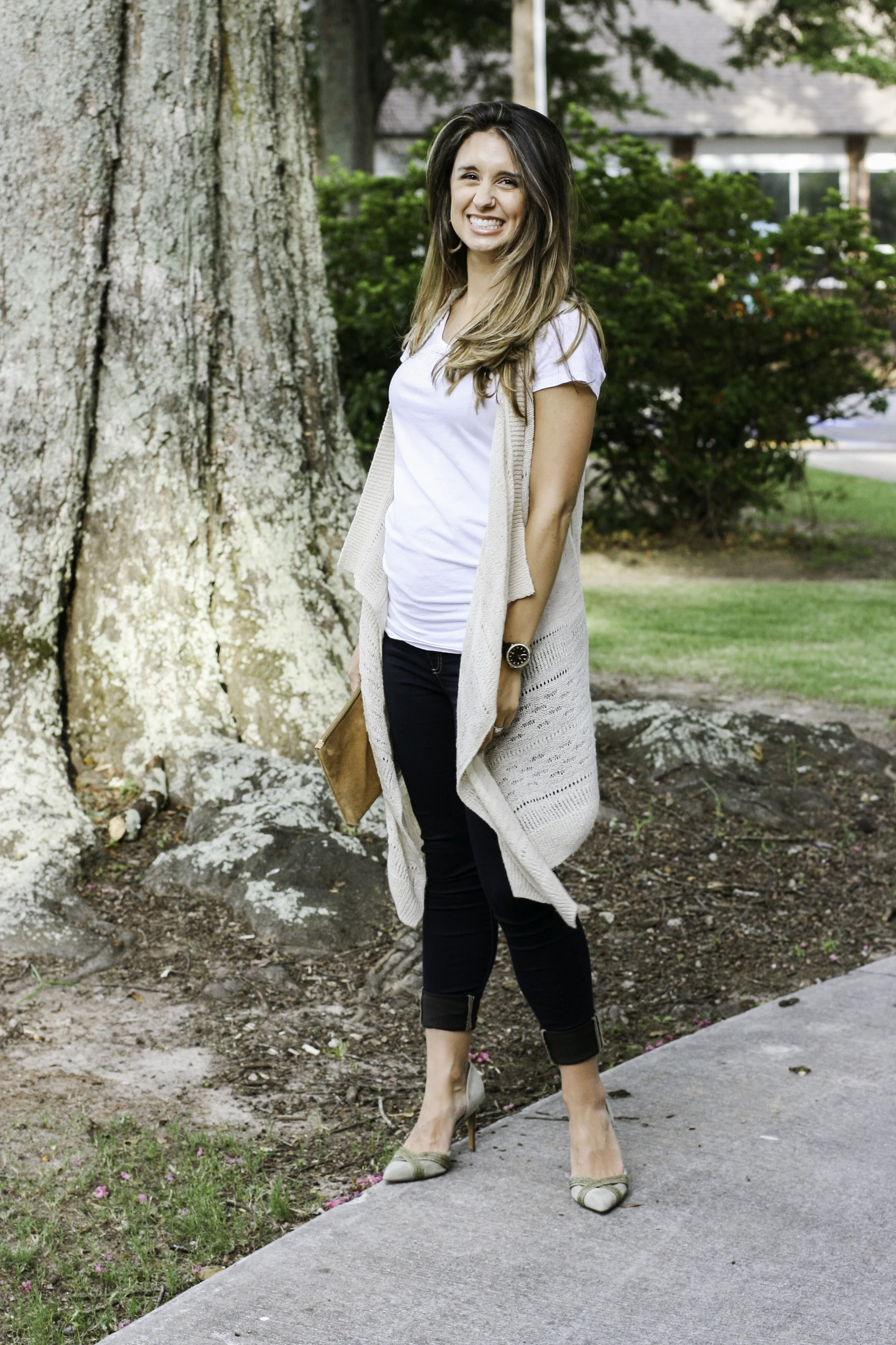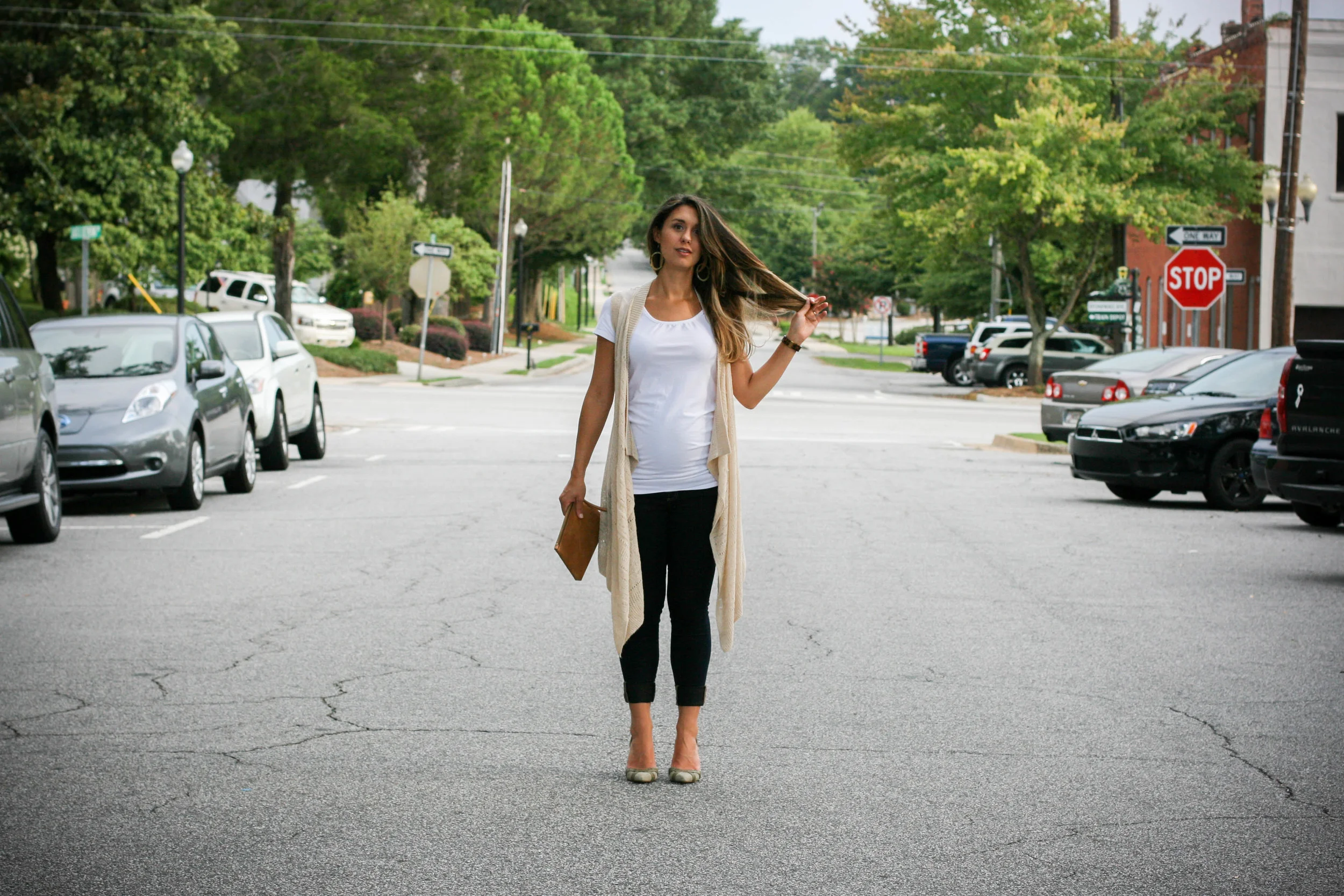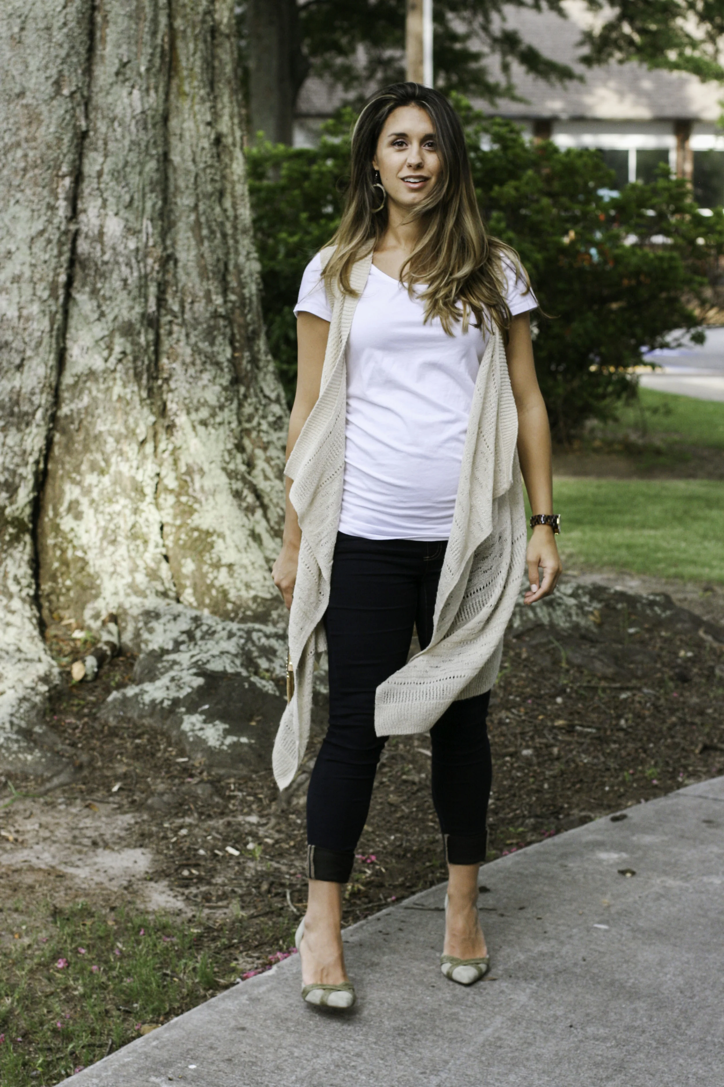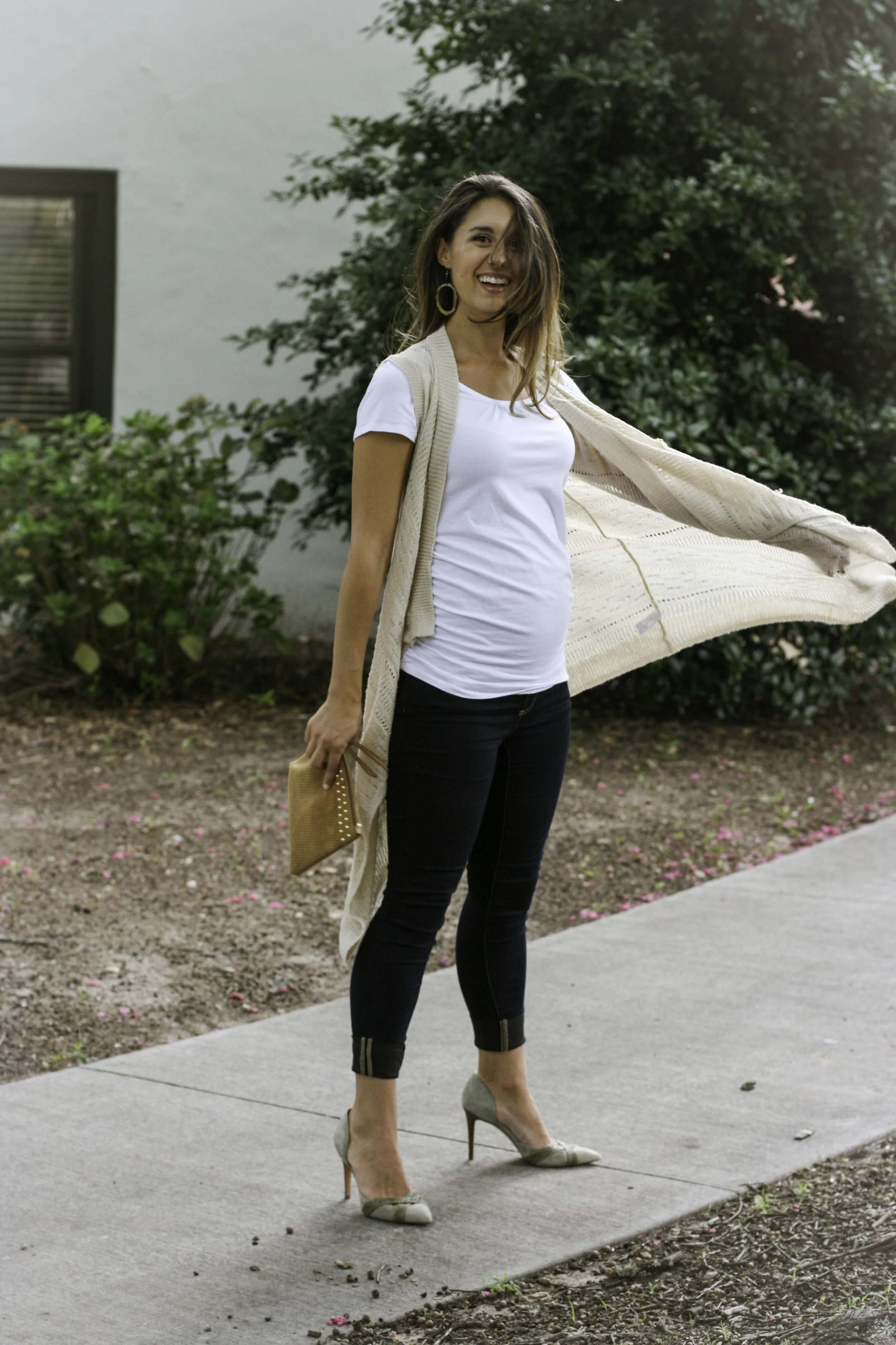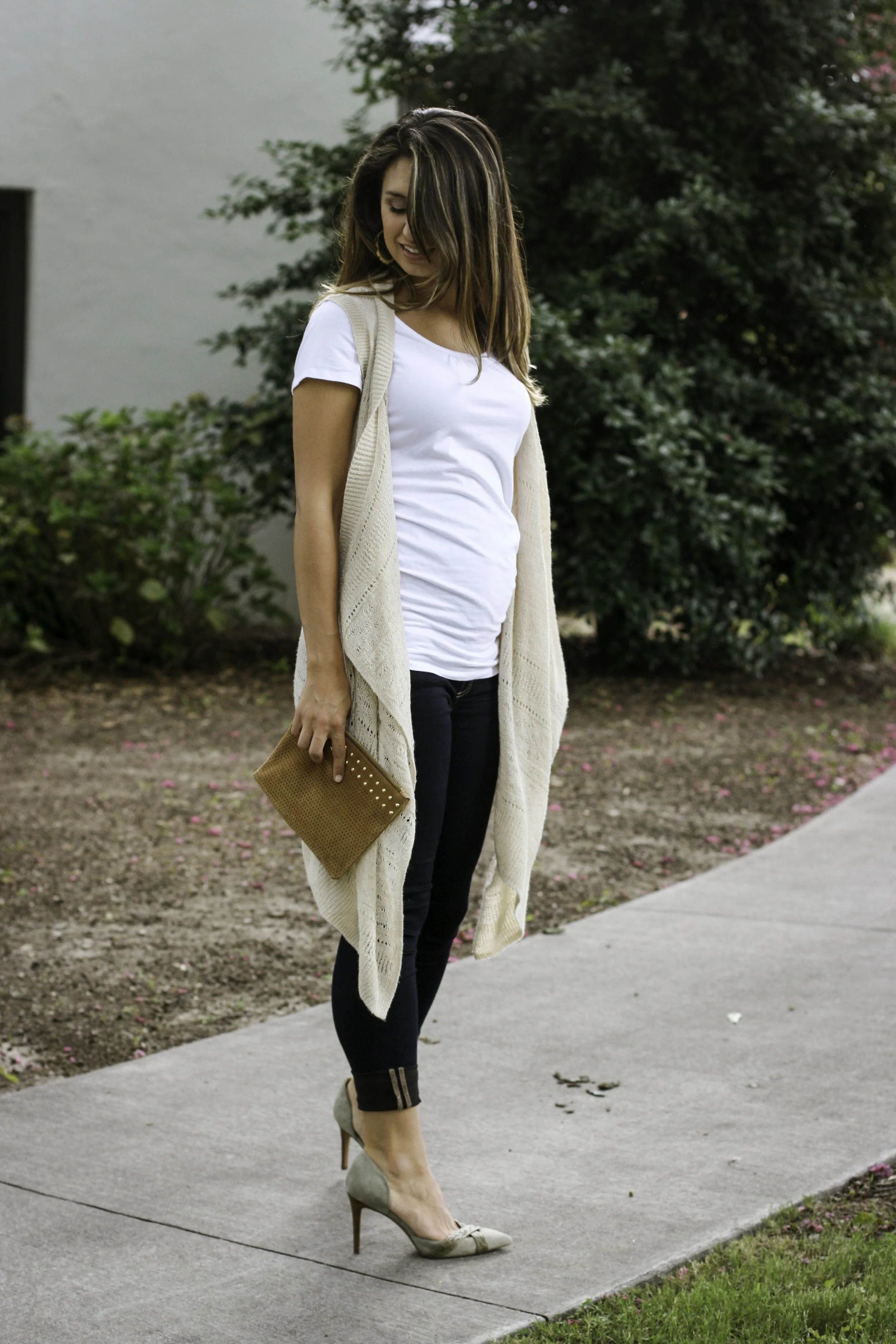 Motherhood Maternity Top, Gap Maternity Jeggings, Knox Rose Cardigan (sold out but similar here and here), Banana Republic Clutch (c/o), Banana Republic Pumps (c/o), Michael Kors Watch