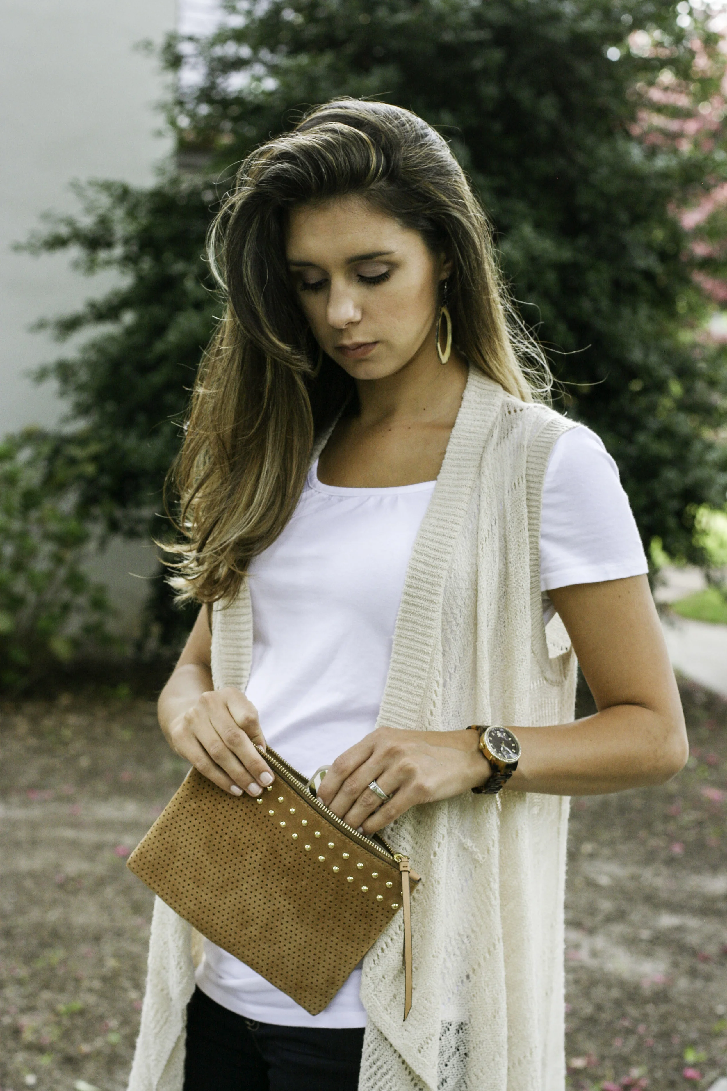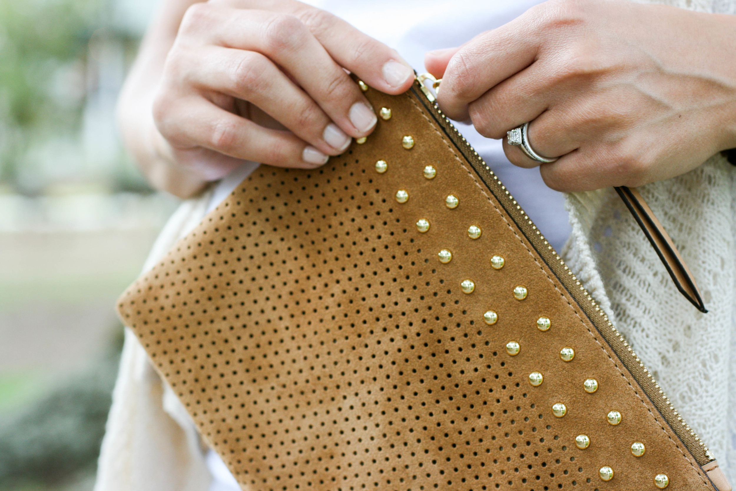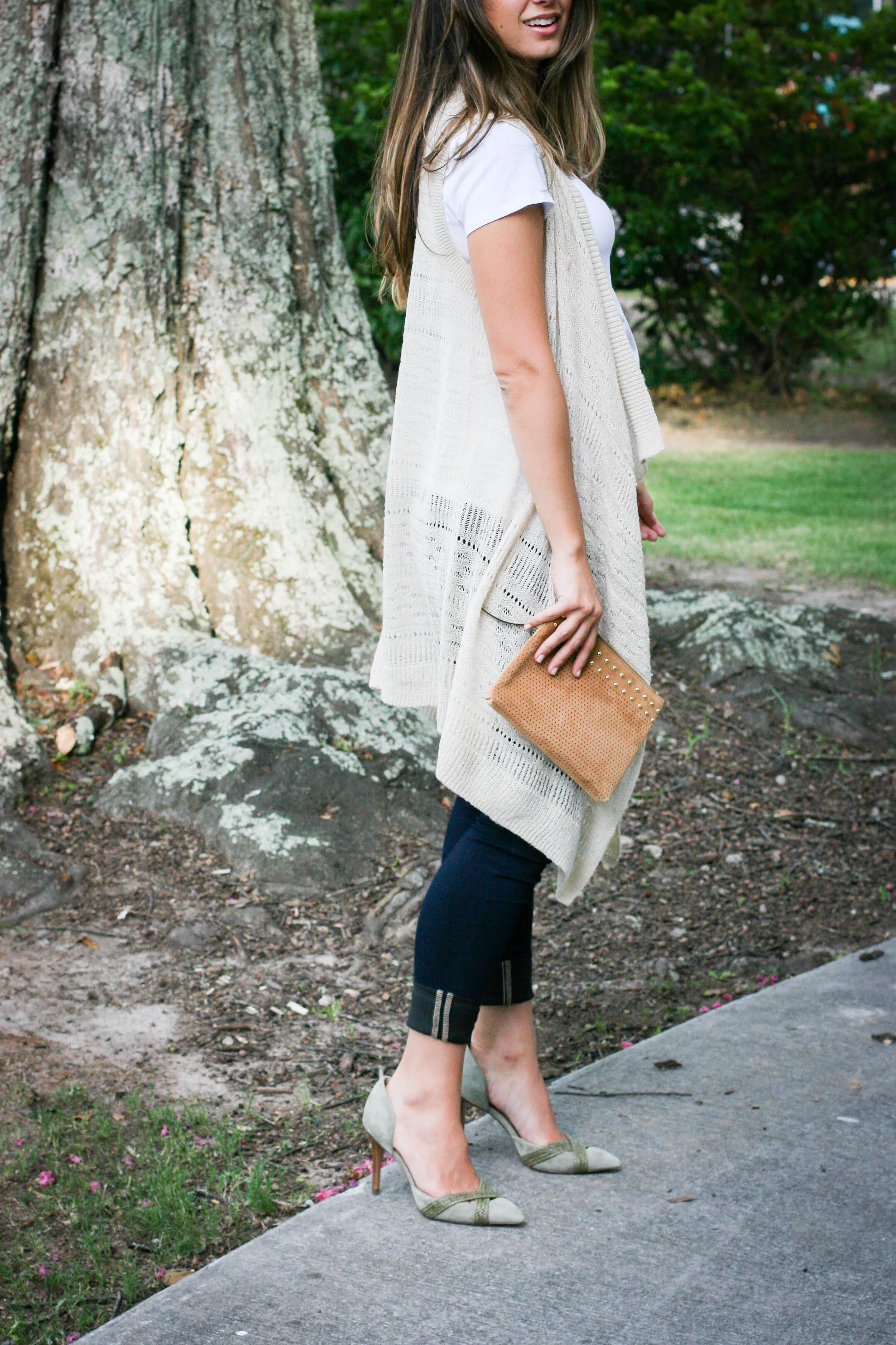 I assembled this airy outfit of denim, white and cream for our date night last week. I love this combination of neutral shades and textured accents - adding this Banana Republic small stud-suede zip pouch and Delise Woven-Strap D'Orsay Pumps were the perfect sassy "pop" for this otherwise simple look. The zip-pouch is great because it's not too fancy but it's really sleek with those studs. And it smells like that yummy Italian leather - you know that scent that makes you want to eat a bag or shoes? Yep, this has that going on. And of course, need I say anything about those shoes? I mean seriously. Banana, I wish you would make cuter clothes. #kidding #iwantmore #clothesnotcandy