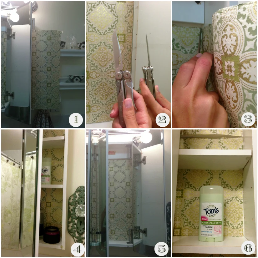 1. I pulled out all the toiletries in the medicine cabinet and wiped everything down again. I removed the shelves and then I tucked the paper behind the mirror. Some excess paper hung outside the cabinet. It's all good.