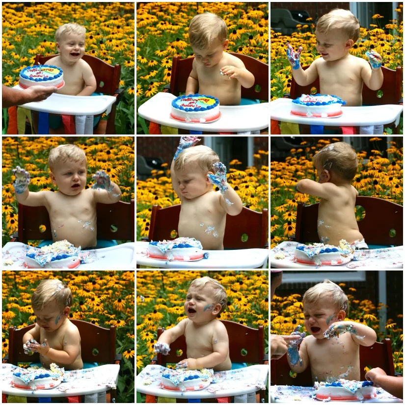 Sweet boy. It was just such a big day for him, with all the people around him fussing and making a big deal. He really didn't know what to make of it. And he didn't even try to eat the cake. Which is a shame, because Publix really does make a mean b…