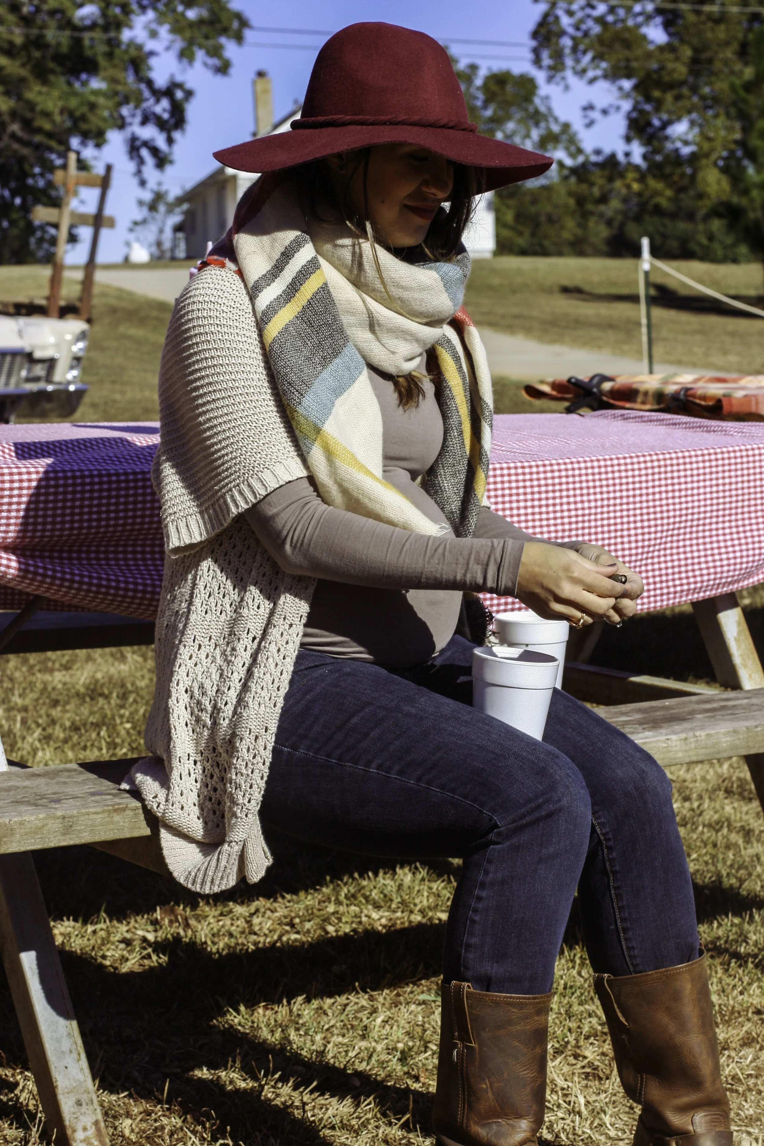 Blanket Scarf (borrowed from my sis, similar here and here), Free People hat (past season, similar here), Gap Maternity Shirt, Gap Maternity Jeans, Anthropologie Sweater (past season, similar here), Frye Boots (on sale here!)