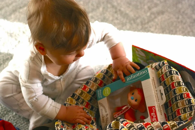 I might have overdone it on the Easter basket. Well, it wasn't an Easter basket as much as it was a piece of luggage, his own little luggage bag! We are doing a good bit of traveling over the next few months, and I can't keep stuffing his goods into sticky Trader Joes tote bags. His bounty floweth over. And so of course, the bag just had a few goodies inside, MOSTLY NEEDS, like a bathing suit and sun hat and swim diapers. And a toy. And a book. And maybe some new shoes. I MIGHT BE OUT OF CONTROL.