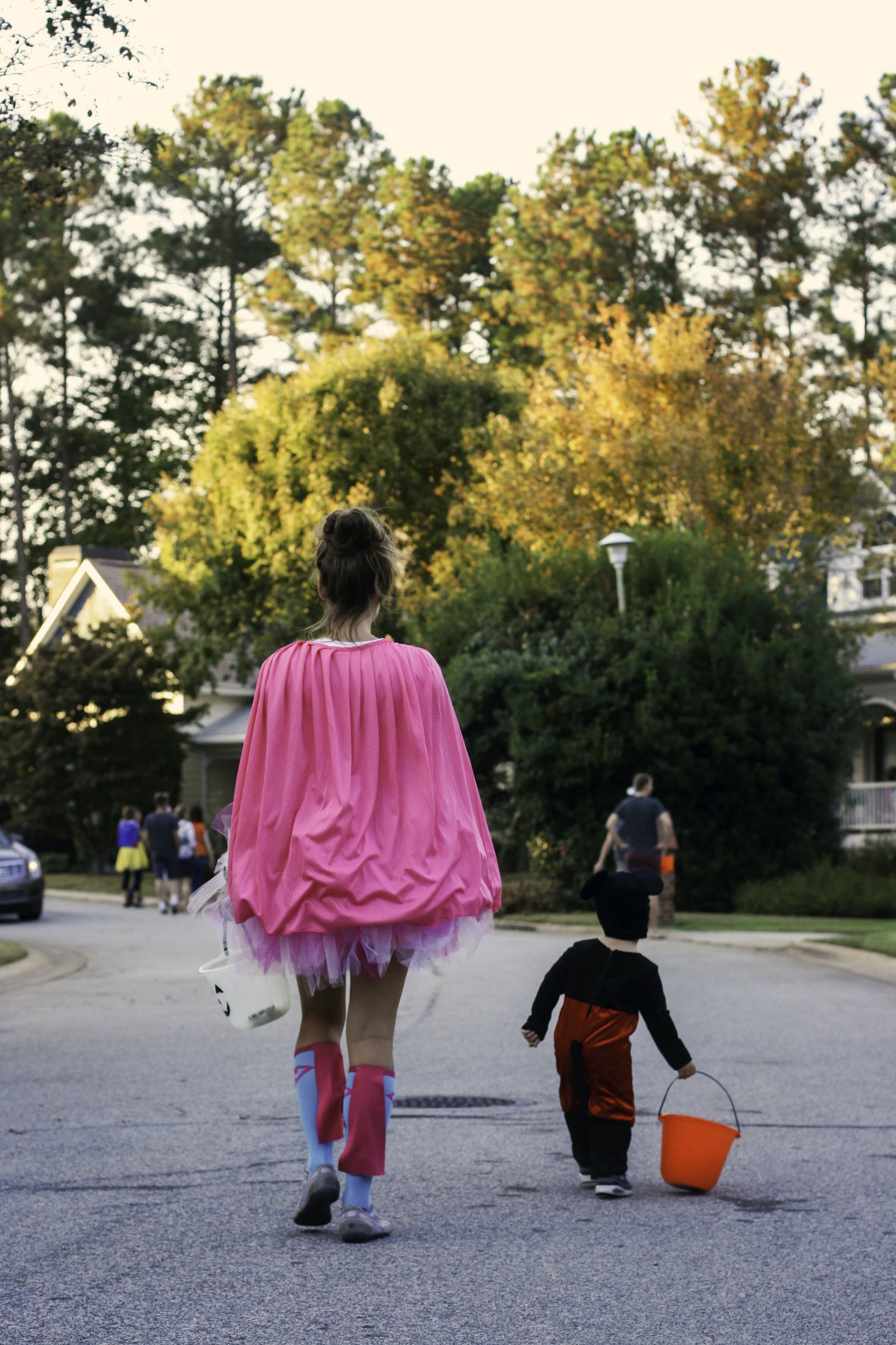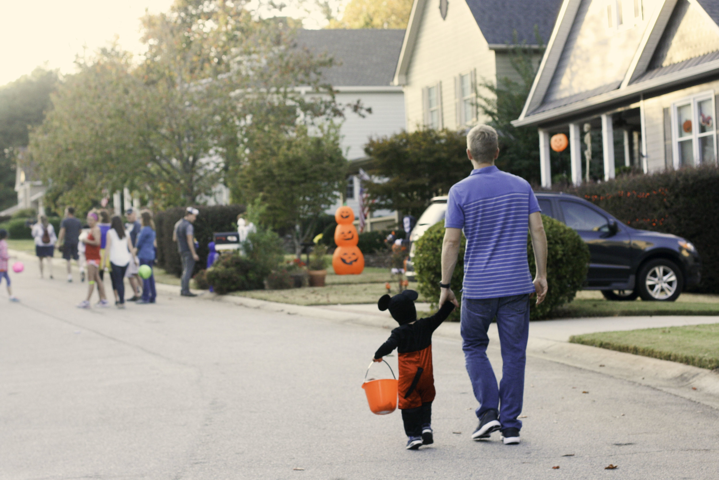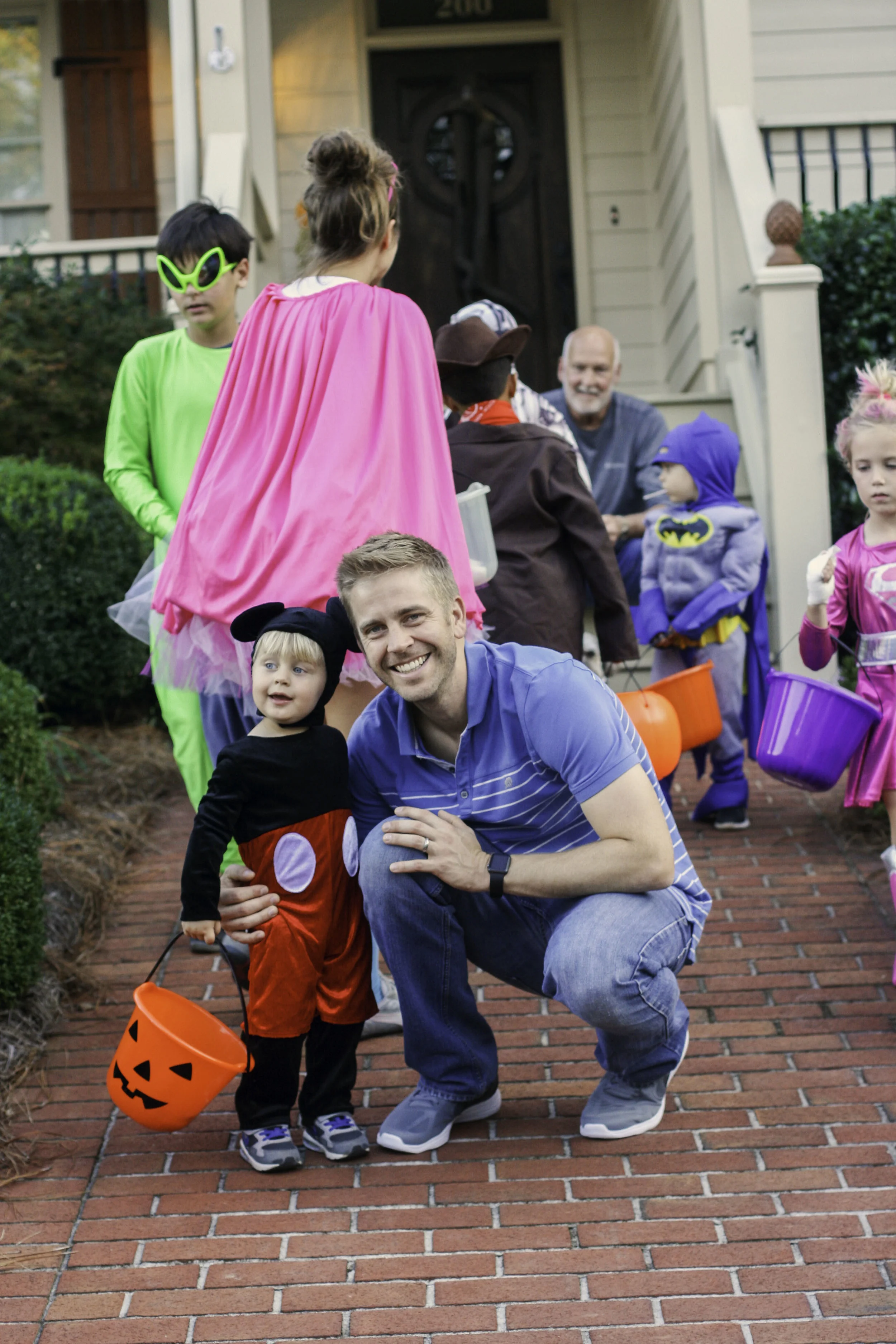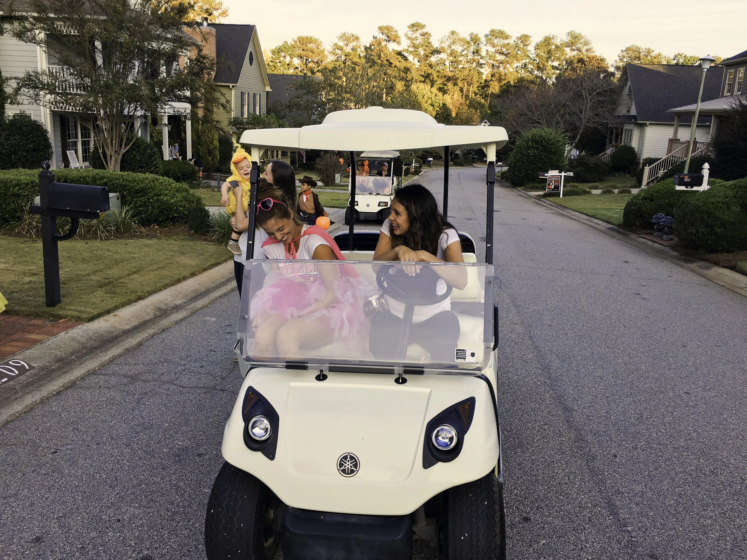 We rode our golf cart a few neighborhoods over where the houses aren't decorated too scary and the sweet neighbors wait on the porch with candy. We like to go extra early, because I don't want to expose Everett to anything too scary. This little Halloween tradition has been in our family over the past few years, with all of Everett's local cousins. And friends, too!