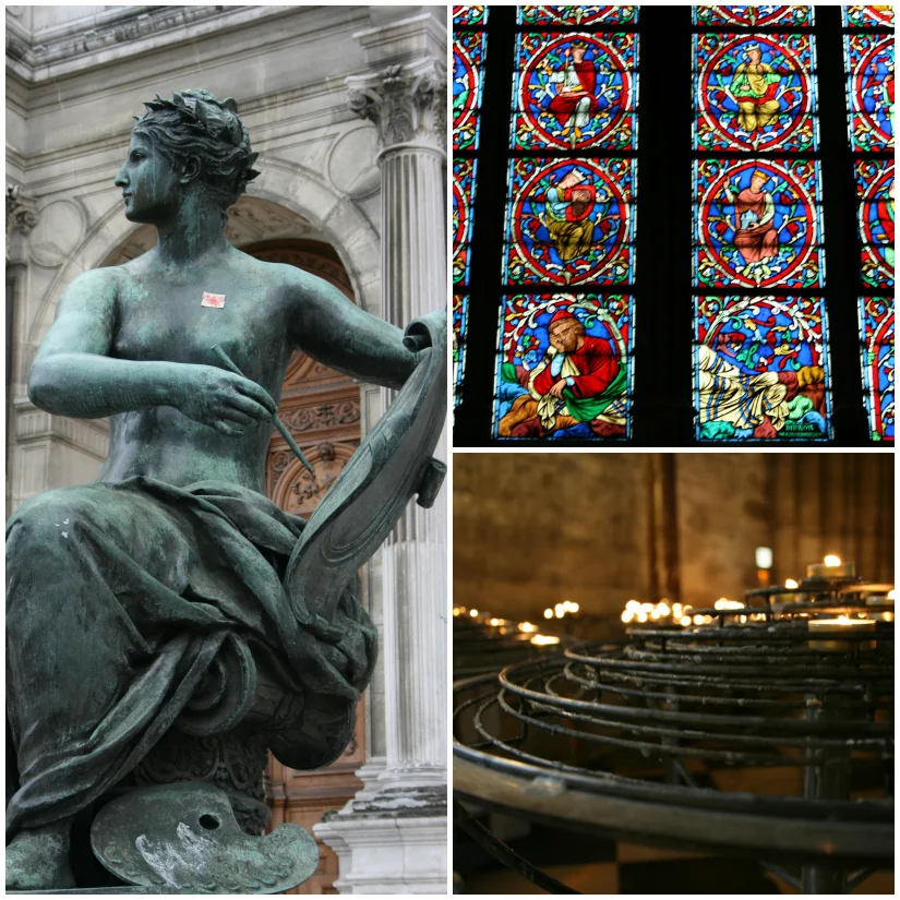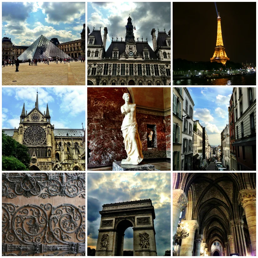 // From Left to Right: The Louvre // Something awesomely french // Eiffel Tower// Notre Dame exterior // Venus de Milo// Our view from Montmarte// An extremely french door // Arc de Triomphe// Notre Dame interior //