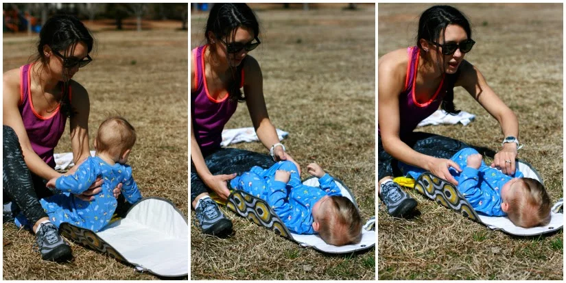 I have used a few different diaper changing stations, but when Baya sent me this one I was floored by how quickly it became my favorite. It's super small and portable (big bonus points for that) and has an interchangeable wristlet/purse strap that allows you to carry it a few different ways. On those errand days when I'm running around town and don't need to take my enormous diaper bag everywhere with me, this diaper clutch is the perfect option. It's obviously cute (no dorky mom product here!) but it's also super functional. There are two compartments that I can easily tuck a few diapers and packs of travel wipes into, along with a separate zippable pocket that I toss my phone and keys into, and voila, we are ready for an hour or two out and about! I have really loved having this for quick diaper changes in the car (especially on my recent road trip) and in public places. See below for more pics of this handy little tool "in action" and for a giveaway to win one for yourself!
