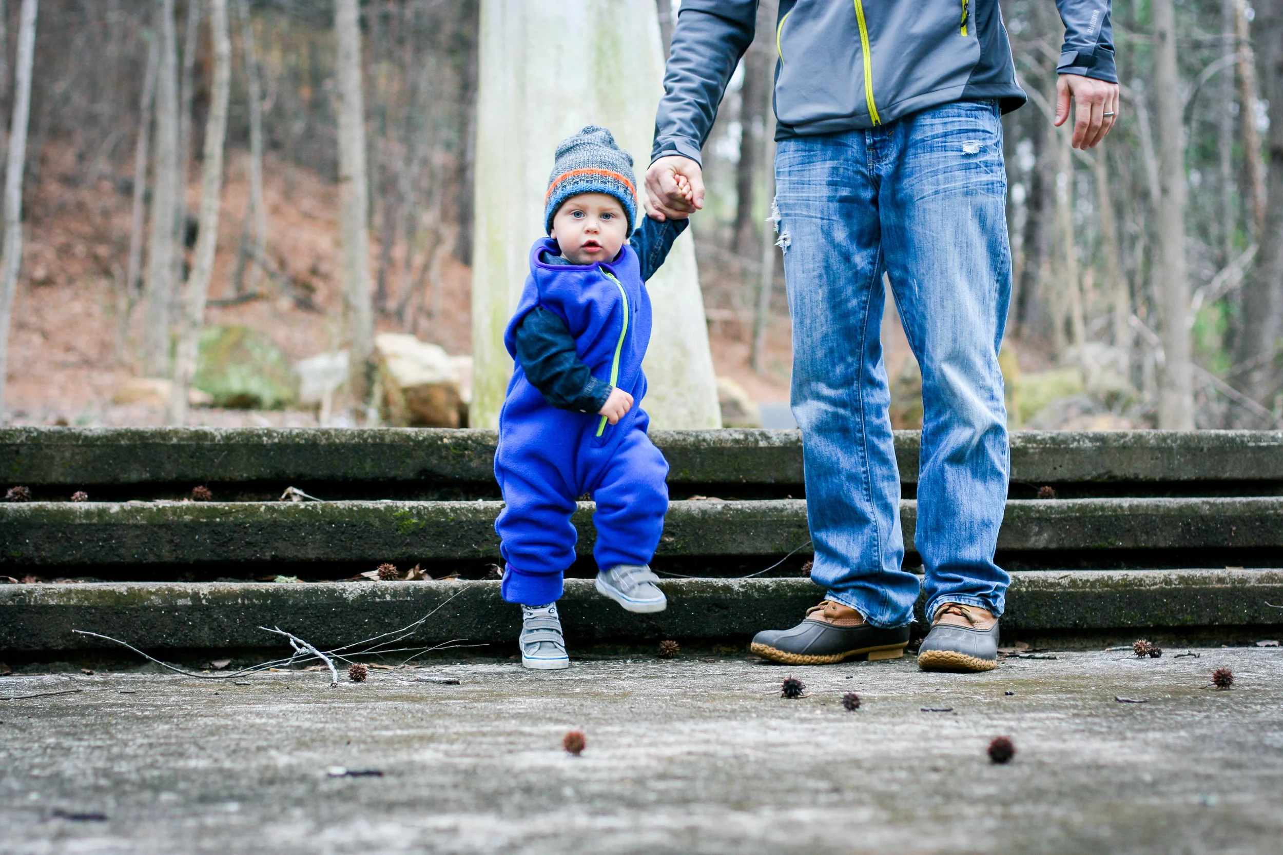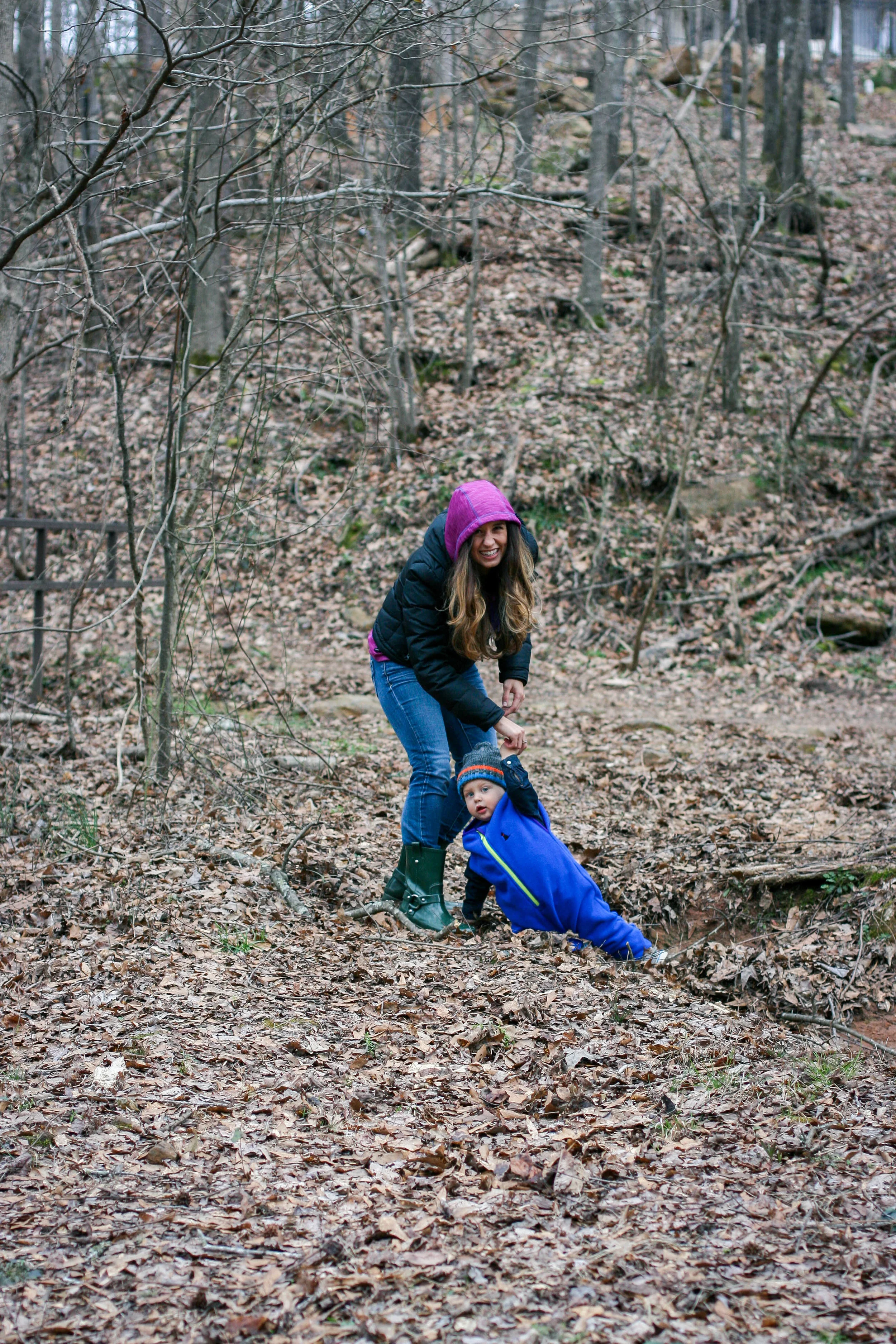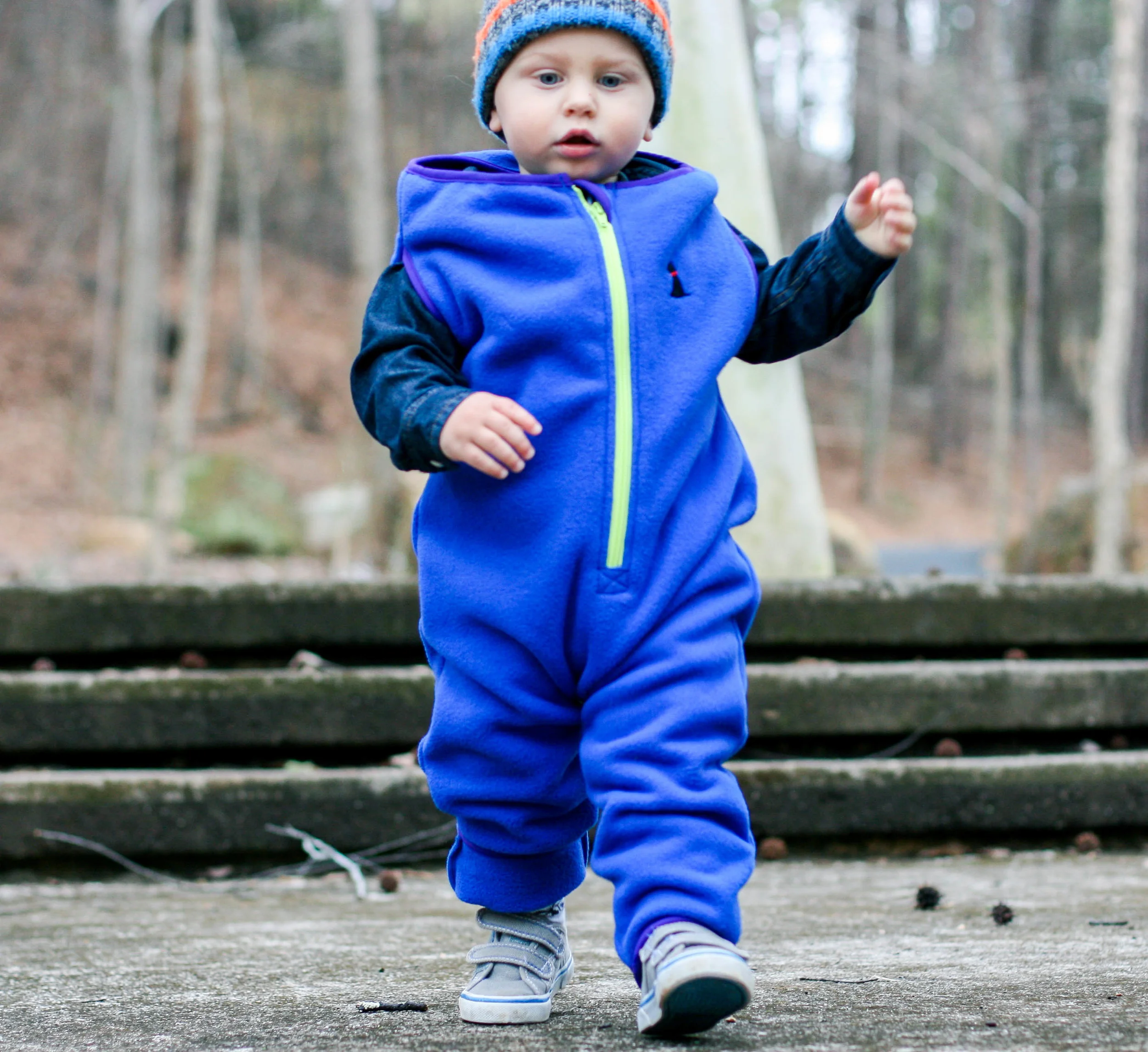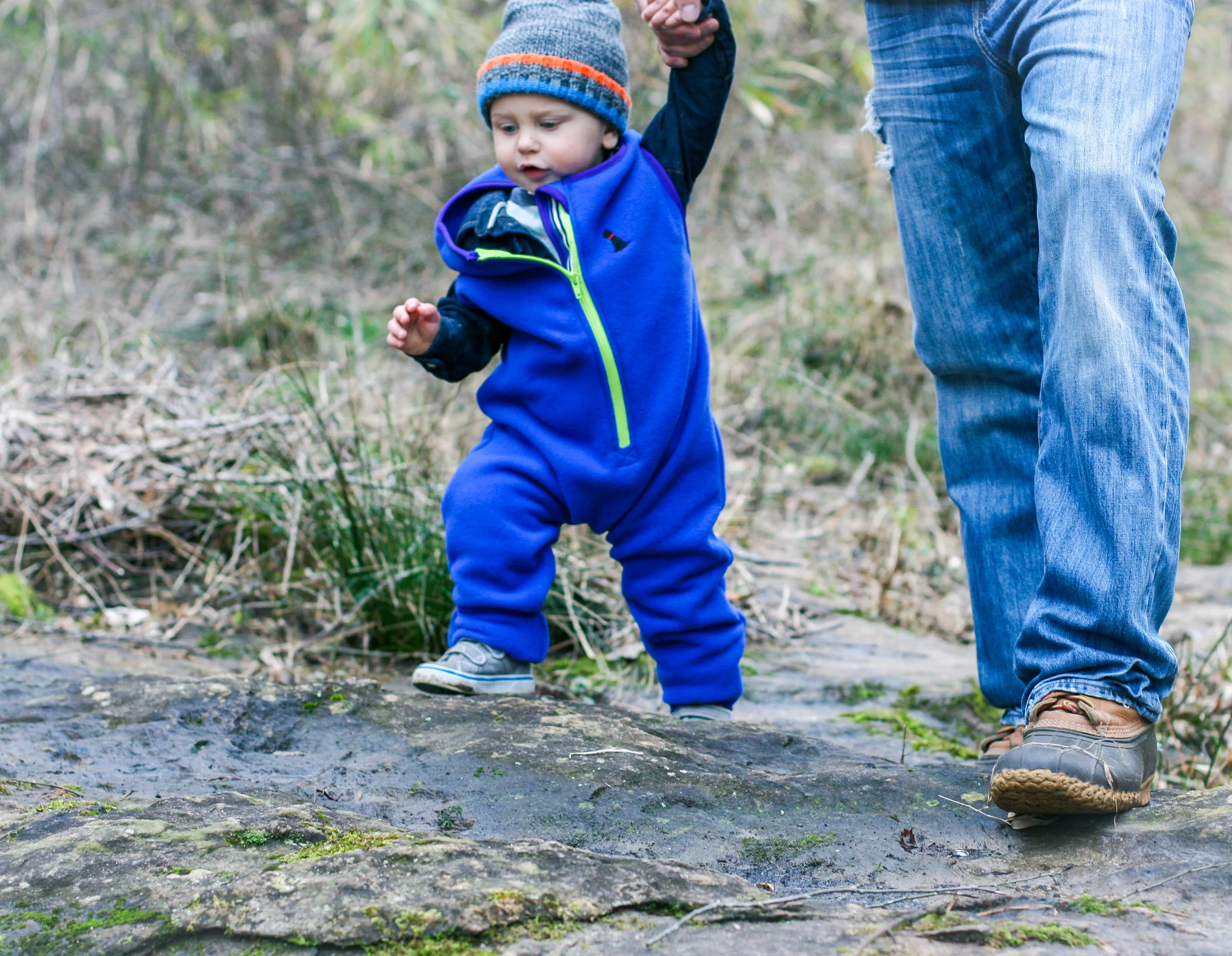 Until now, that is. The Cozey7 Trailhopper has been the answer to our cold-weather problems. Not only does Everett love putting it on (because he knows it means he gets to play outside!) but it's extremely thick and durable, so he can be as rough and tumble as he likes and I don't have to worry about his clothing. It's made of a performance-grade Polartec fleece, and the feet fold up and down to adjust the size, allowing him to wear it for as long as possible before switching to the next size. Surprisingly enough, I did a little research and there is almost nothing like this on the market - unless you want to dress your kid in a full-on snow suit. I love that my son can wear this as a final layer over his normal clothes and enjoy the toddler life most abundantly - he's worn it camping, during the Snowpocalypse, and even riding around on the golf cart (because in our town, there is more golf cart path mileage than actual road mileage). We've been testing this product for months now, and I must say - I'm a believer. I wouldn't share this with you if I weren't. If you're an outdoorsy family (or if you aspire to be!), this outwear layer will be just as important as shoes and a hat. Check out a few pics of our little guy in his Trailhopper - and scroll below for a promo code and to enter a giveaway to win one for your kiddo!