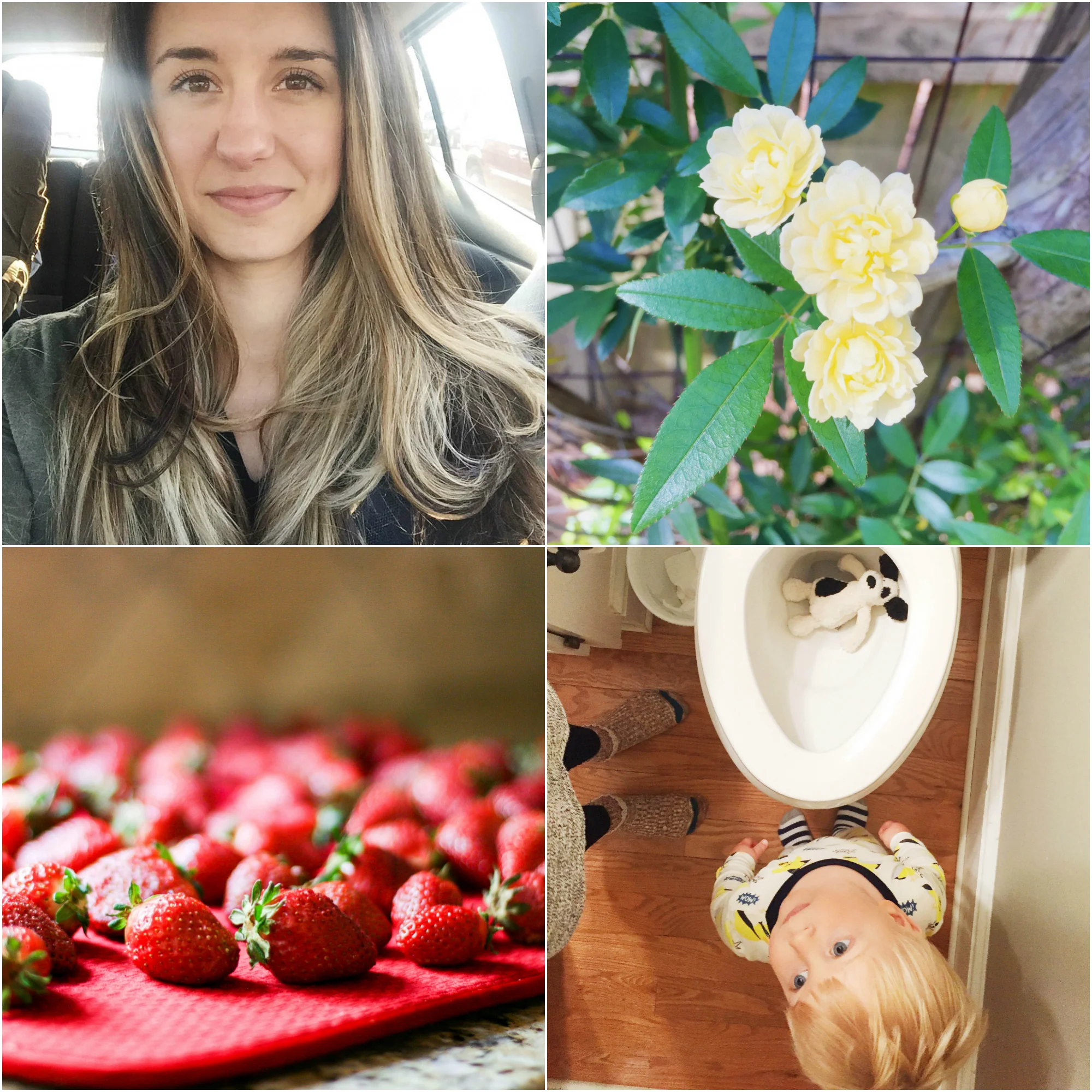 Top Left: Colored my hair again. It's going from ombre to straight up bronde. // Top Right: I found roses growing in my yard. I almost cried because I almost BOUGHT SOME to grow this summer. Best discovery ever. // Bottom Left: My friend Liz brought over freshly picked organic strawberries. Because she's the sweetest human on this grand Earth. I made strawberry bread. // Bottom Right: As you know, Everett's puppy Oscar has been coming to life lately, even to the point of eating pizza with us. The most recent display of Oscar's independence was when Everett "took him potty". I wasn't pleased. But I was laughing. //