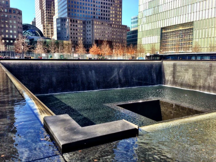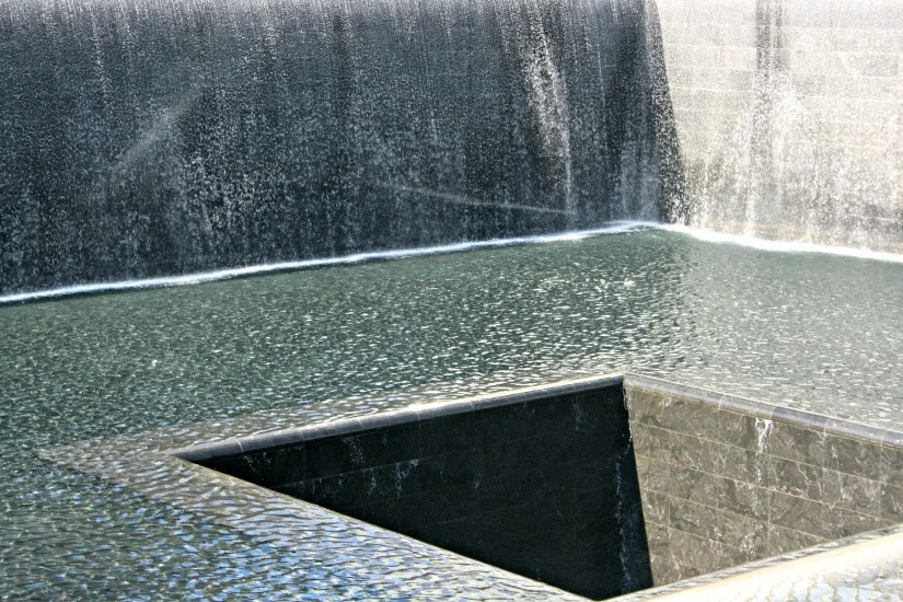 It's a little bit haunting. A pensive place to reflect on those tragic events. The screeching sounds of the city are drowned out by the rhythmic fall of the water, and for a moment, you become a little bit numb. This lands marks the spot. Right here. Where planes smashed and people leapt to the ground from their burning buildings and where rubble and ash and smoke swallowed them up whole.