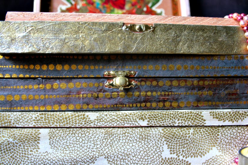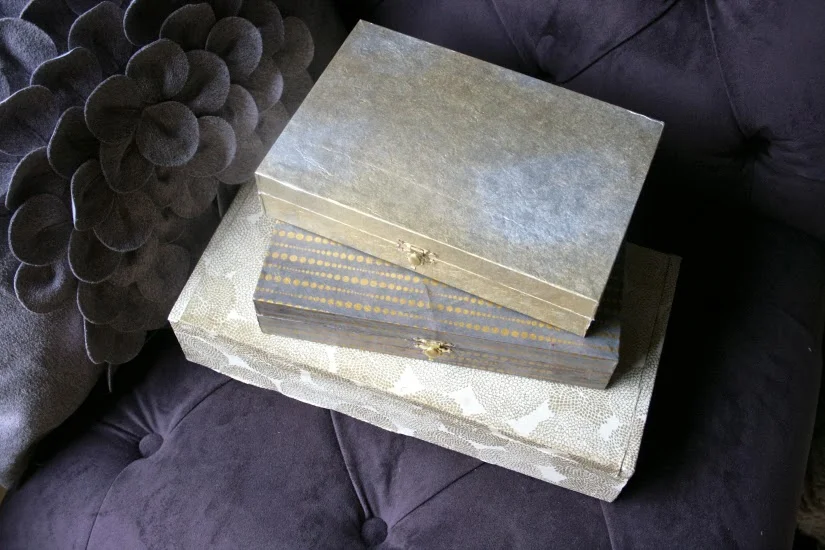 Christmastime is so twinkly and magical. I was inspired by these West Elm's boxes, like this and this. I thought the mixture of gold, silver and charcoal colors would look really pretty on my dresser, so I began brainstorming. These boxes were clearly out of my price range, so I thought, "I will just make my own." My DIY desire was confirmed when I stumbled upon these cigar boxes (below) at a flea market in the neighborhood. They are super legit, solid wood with hinges and everything - the guy sold all three for $20, which I thought wasn't too bad. Then I began hunting for the perfect paper. I went over to my friends at the to-die-for Paper Source, where the ladies there helped me pick out these three styles: Gold on Cream Mums Fine Paper, Metallic Wash on Natural Fine Paper & Gold Linear Dots on Slate