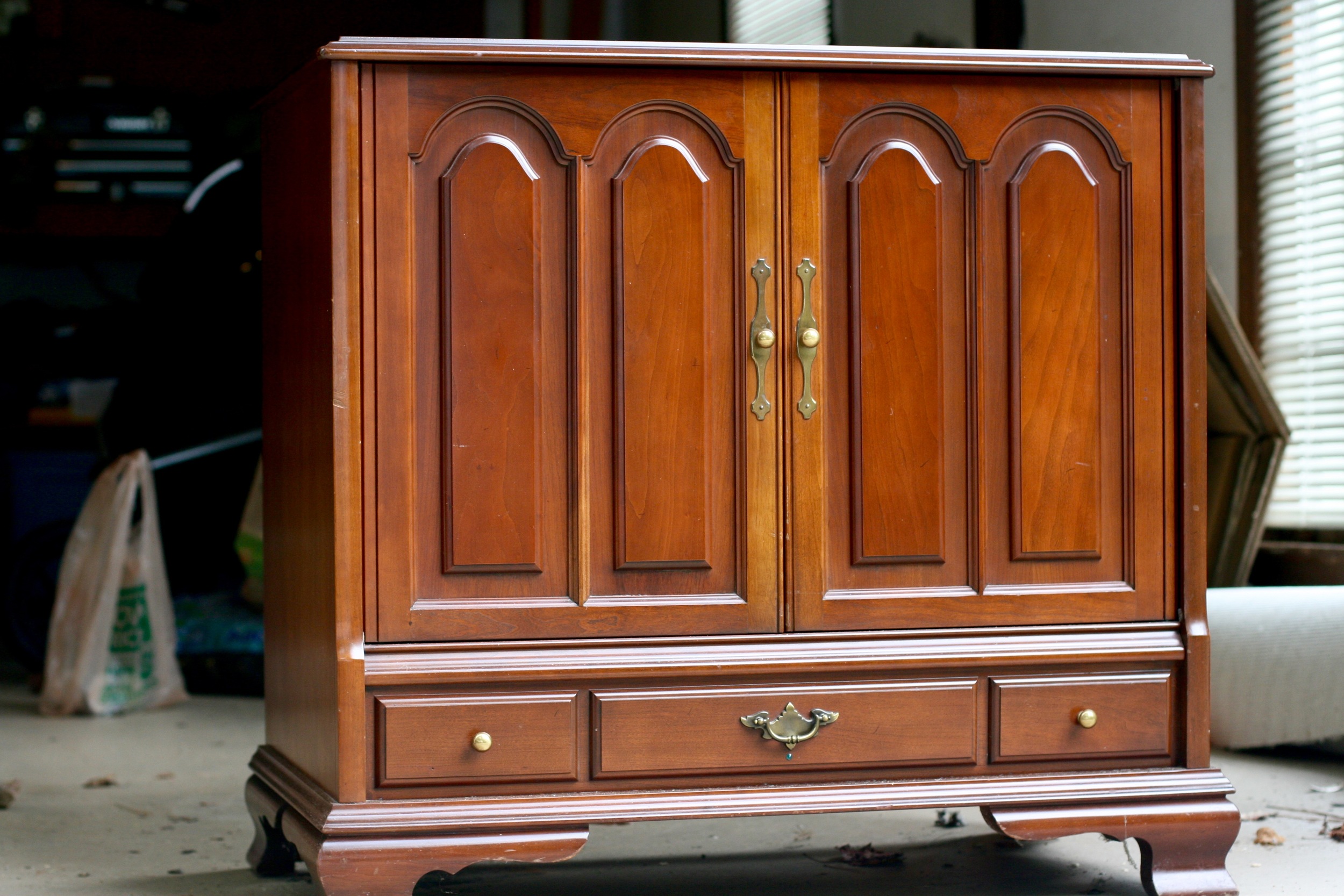 As you can see, the piece was a lovely mohaghany cabinet with brassy hardware, but it felt a bit bulky and dated. Since I had some success with chalky paint on my bedroom furniture, I decided to tackle this one with the same approach. But this time - I made my own chalky paint! I will share how incredibly easy it is next week on the blog. But trust me - you will never want to pay high dollar for chalk paint again.