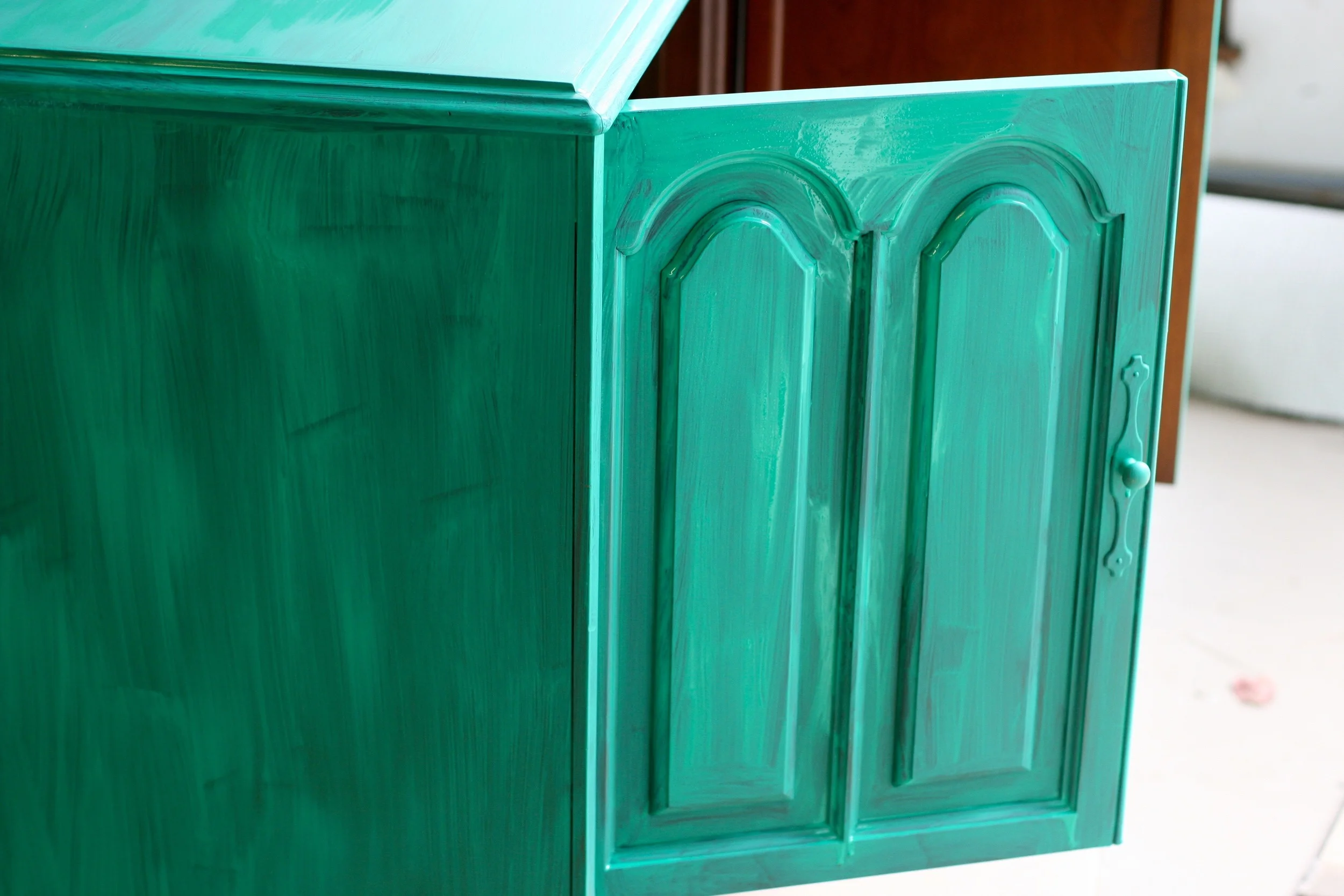 Then things got really crafty. I used this Varathane Wood Stain in Kona to tone down the shade of the green and give the furniture an antique effect. There are a lot of antiquing waxes on the market, but this was by far the least expensive way to achieve the same effect. I used an old cut up tee shirt to rub on the stain in small sections, then I immediately wiped it off. The stain really soaked into the edges and crevices that I had sanded down, and made the whole piece look like it had been living in the dark corner of an a genie's lair for like a thousand years. Mission, accomplished.