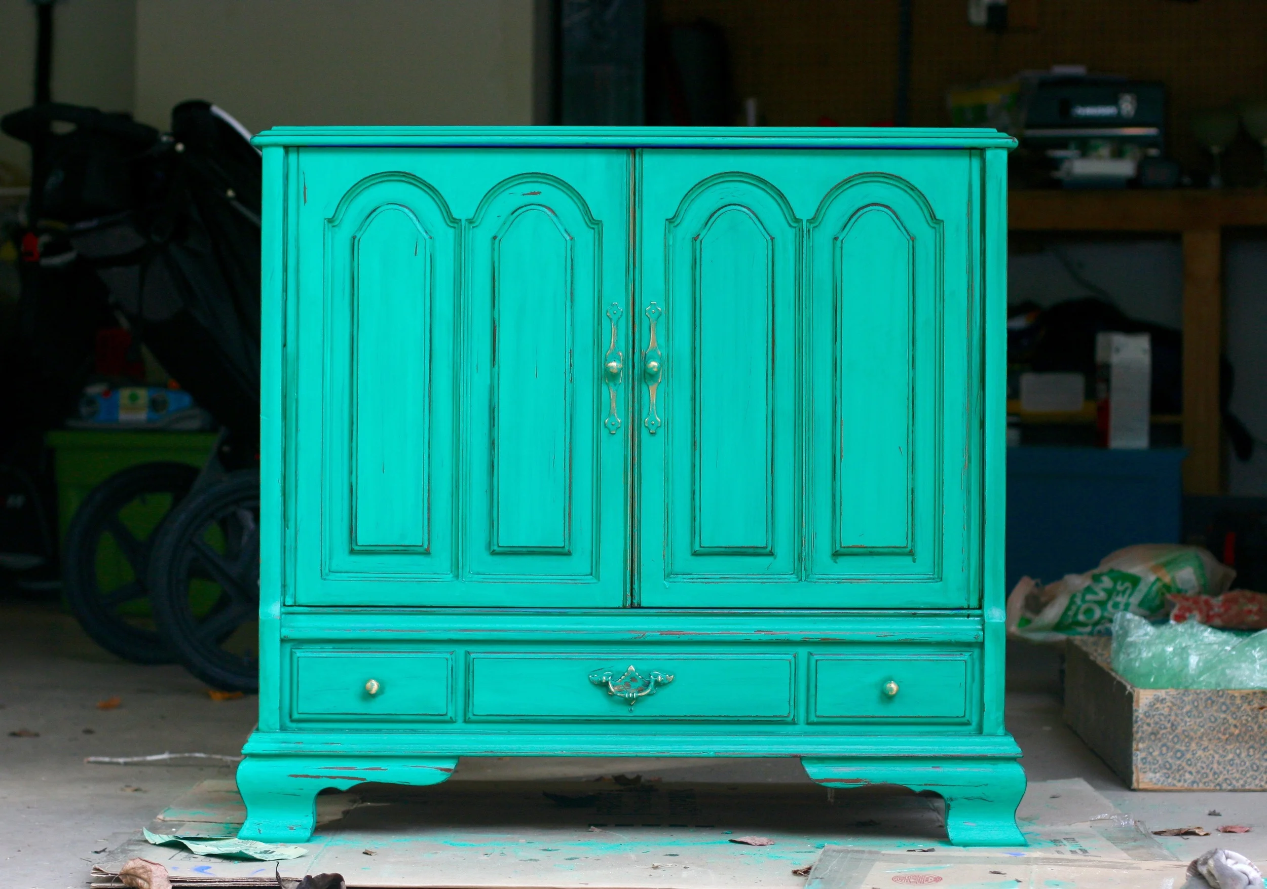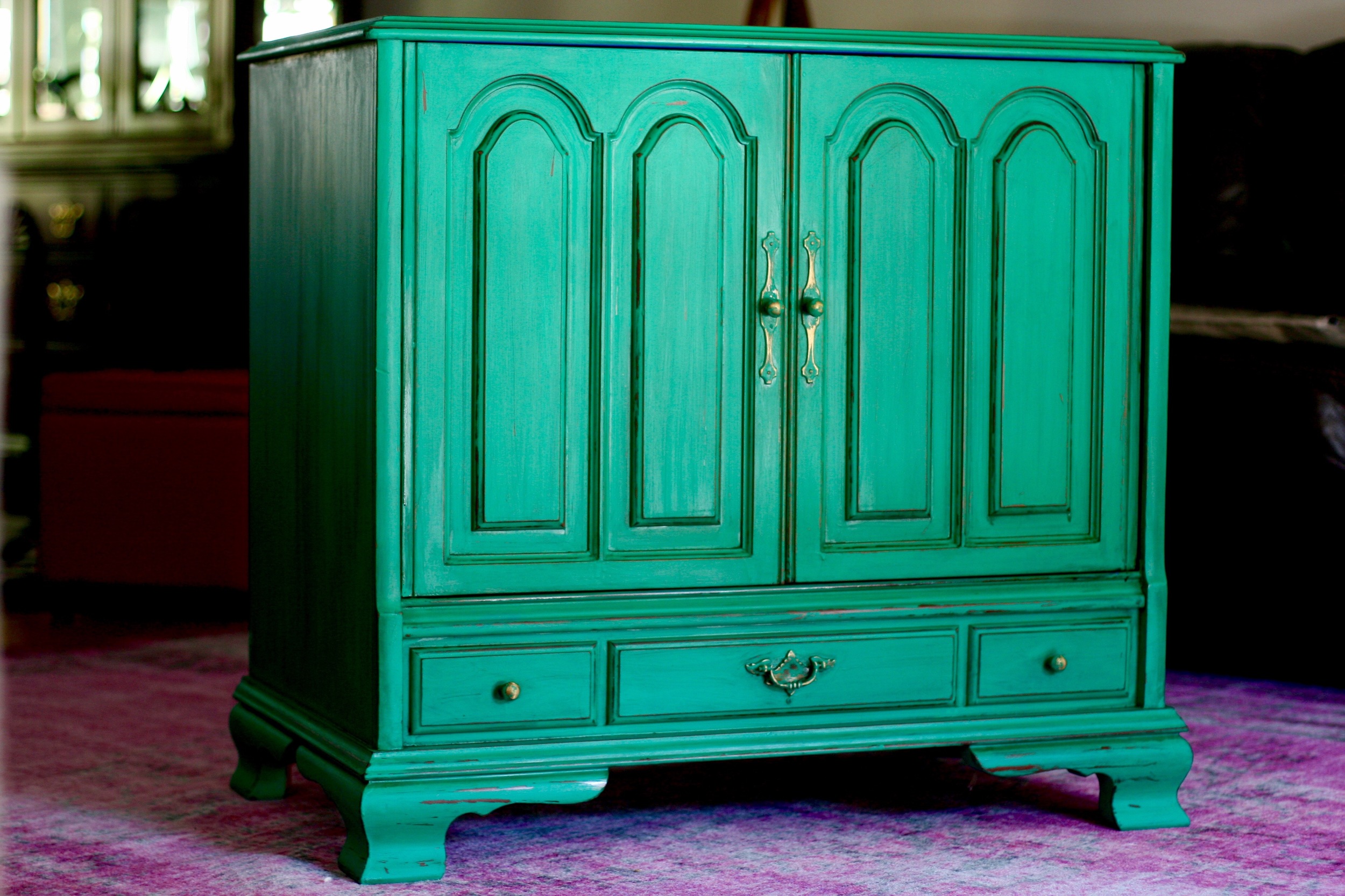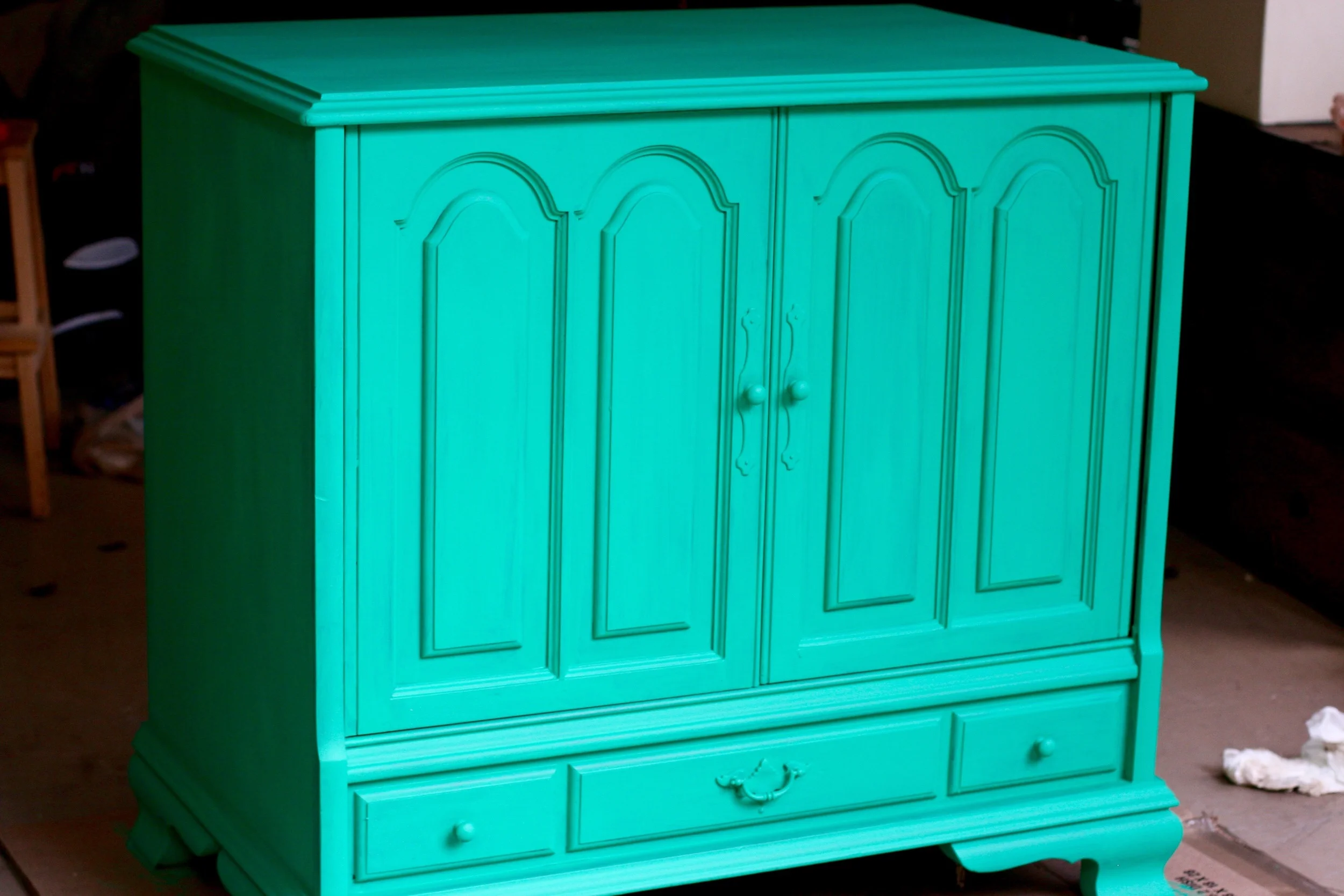 This is perhaps my favorite upcycled piece I've ever done. I was given an old TV cabinet in the slew of free furniture we were given when we moved, and I knew I wanted to turn it into a storage space for Everett's toys in our entertainment room. This actually belonged to my elementary school librarian, Ms. Olham, and was given to someone else, who then gave it to us, so this particular piece of furniture actually has a bit of sentimental value. I was kind of a book nerd, and spent a lot of time in the library as a kid, so I knew I wanted to keep this piece and make it something special. Because of it's largeness and depth, Stevie wasn't sure it would work in the entertainment room, but I knew I had to find a way to make it work. Because, Mrs. Oldham! As I brainstormed about what I wanted for this piece, I was feeling so inspired by the rich shade of Kelly green. I couldn't shake it. So I went with it! Our entertainment room has taken on a vivid, bohemian vibe, and I can't wait to share photos of the entire space once I'm finally finished with it. This piece is one of the centerpieces of the room and I am so so thrilled with how it turned out.