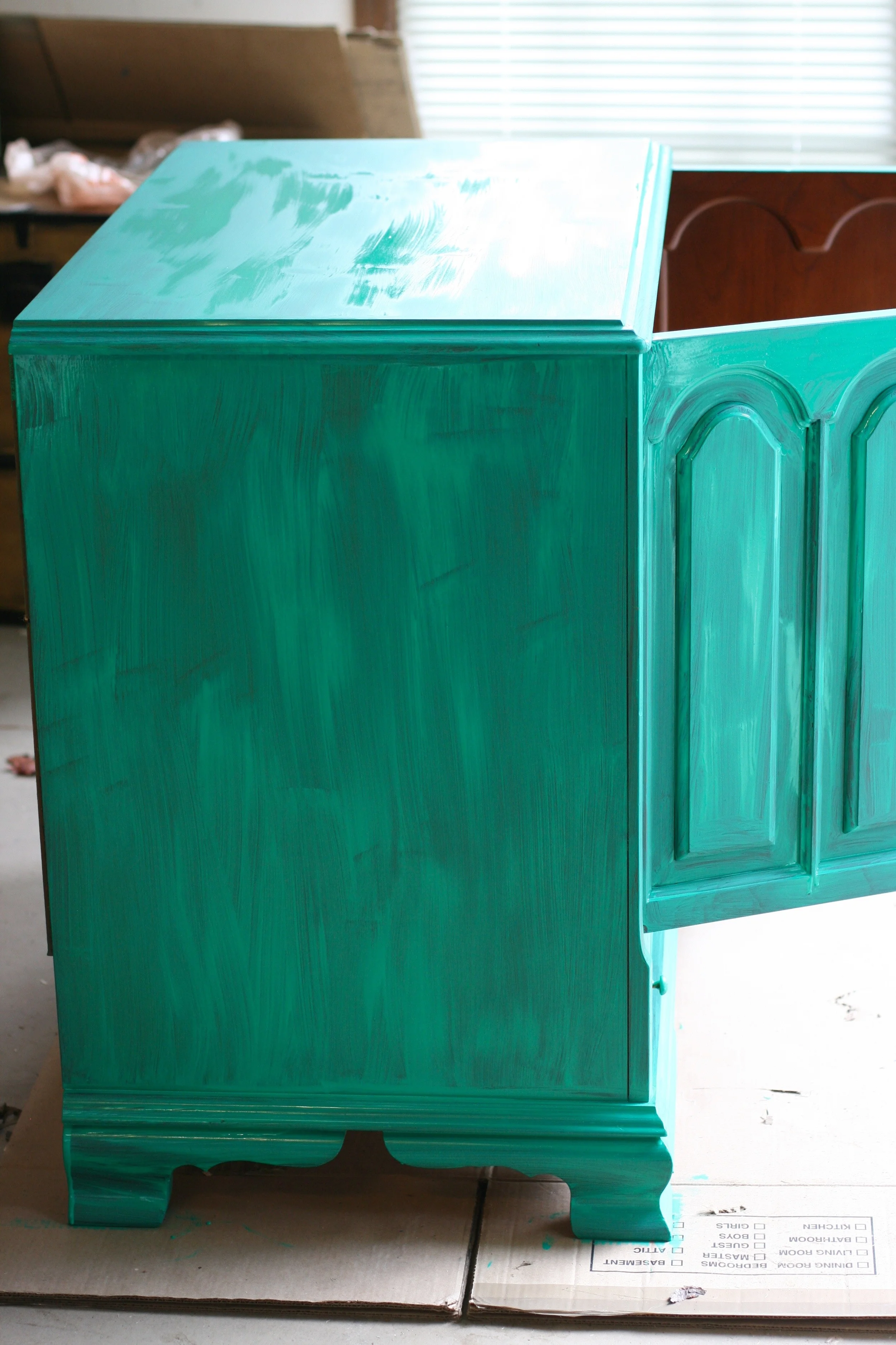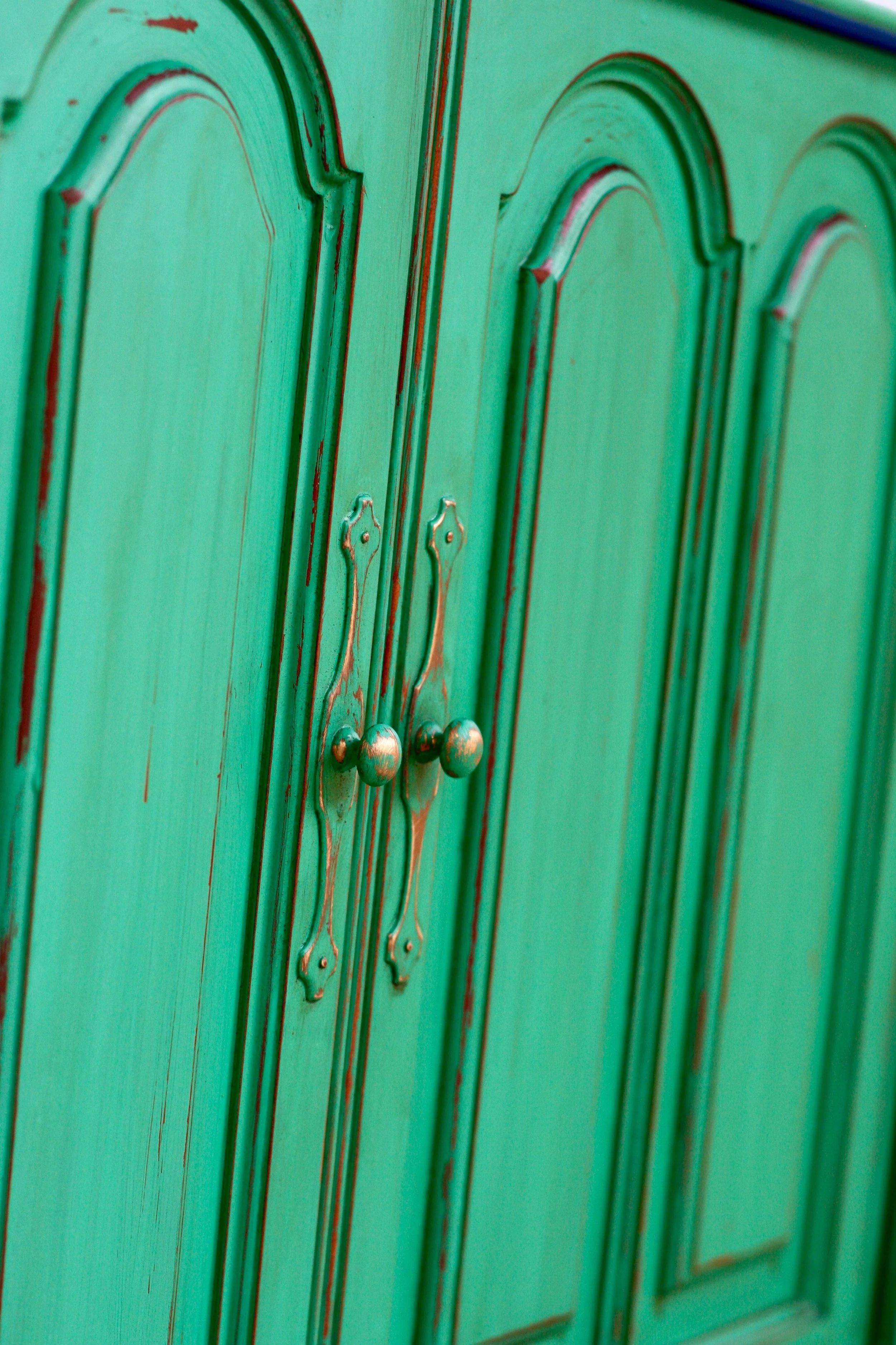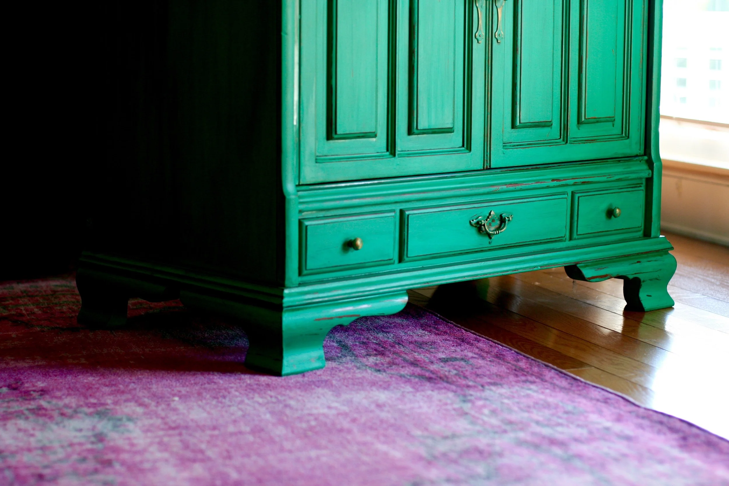 This is perhaps my favorite upcycled piece I've ever done. I was given an old TV cabinet in the slew of free furniture we were given when we moved, and I knew I wanted to turn it into a storage space for Everett's toys in our entertainment room. This actually belonged to my elementary school librarian, Ms. Olham, and was given to someone else, who then gave it to us, so this particular piece of furniture actually has a bit of sentimental value. I was kind of a book nerd, and spent a lot of time in the library as a kid, so I knew I wanted to keep this piece and make it something special. Because of it's largeness and depth, Stevie wasn't sure it would work in the entertainment room, but I knew I had to find a way to make it work. Because, Mrs. Oldham! As I brainstormed about what I wanted for this piece, I was feeling so inspired by the rich shade of Kelly green. I couldn't shake it. So I went with it! Our entertainment room has taken on a vivid, bohemian vibe, and I can't wait to share photos of the entire space once I'm finally finished with it. This piece is one of the centerpieces of the room and I am so so thrilled with how it turned out.