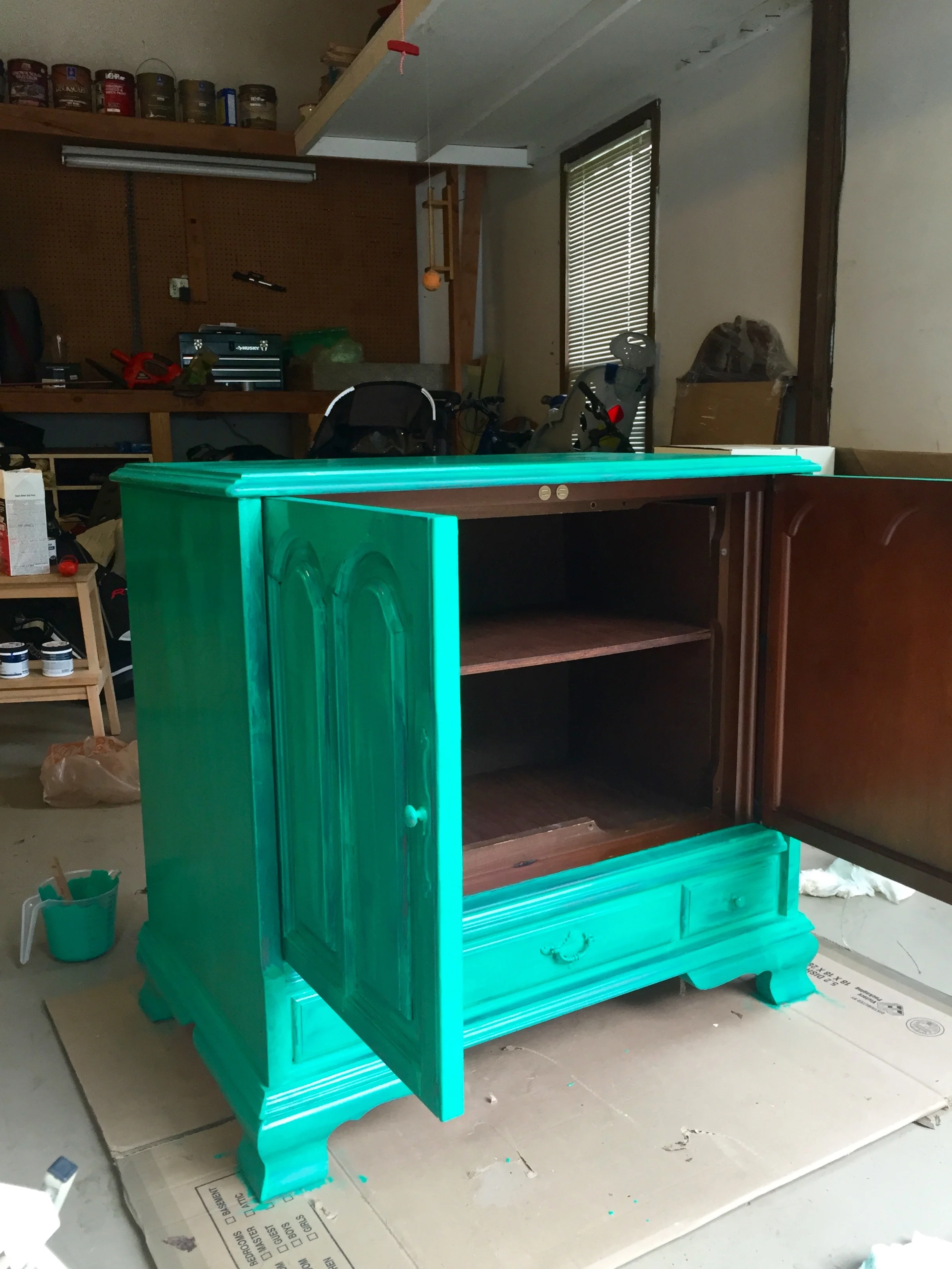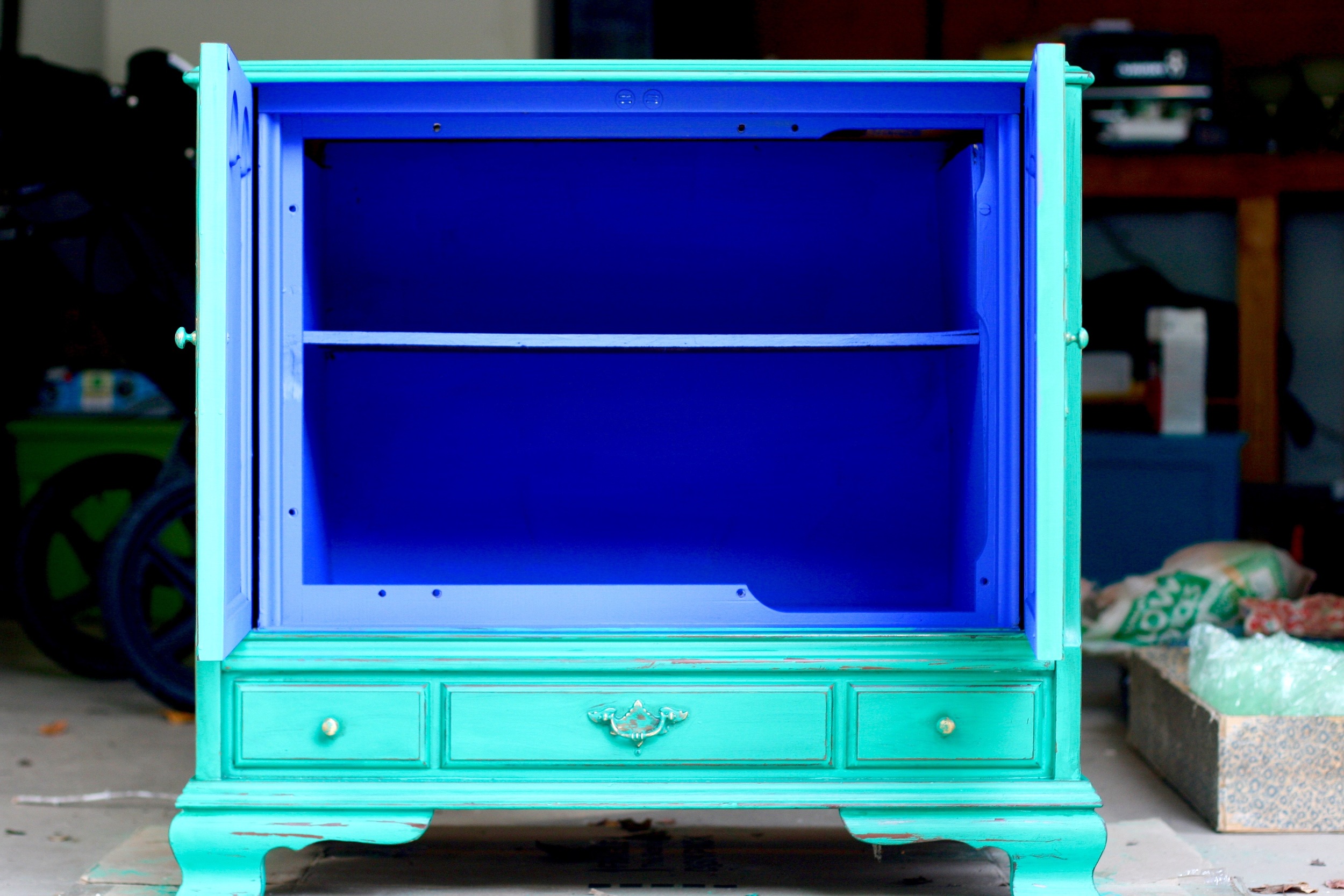 Then I decided to get a little crazy. Okay, crazier than painting a cabinet green. I grabbed another paint sample that I had chosen on a whim while I was at Home Depot, one that I had literally no plan for and just bought because I thought it was so pretty... and decided, what the heck? I'll coat the inside of the cabinet with this sapphire-esque blue! Because apparently I am turning my entertainment room into an arabian bazaar. So Behr Indigo Batik coated the inside of the cabinet. And my soul rejoiced.