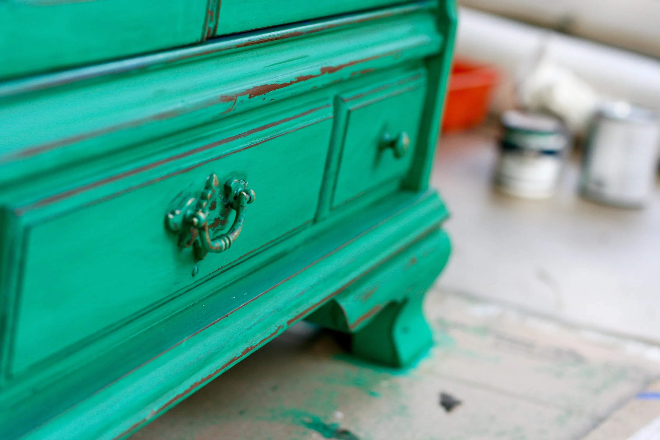 Chalky paint dries to a very matte finish. If you want a little more contrast, depth and texture, I would follow up with some light sanding, perhaps some antiquing (you can see how I distressed and antiqued this Living Room Toy Cabinet), and a finishing coat for protection. If you like a high gloss, you can go with a polyurethane, or if you like something more satin-y, I like this Valspar Chalky Finish Sealing Wax.